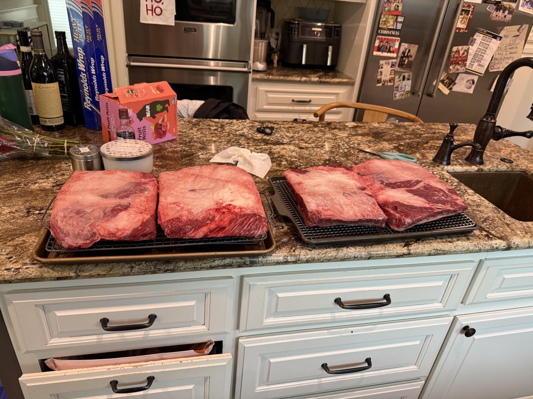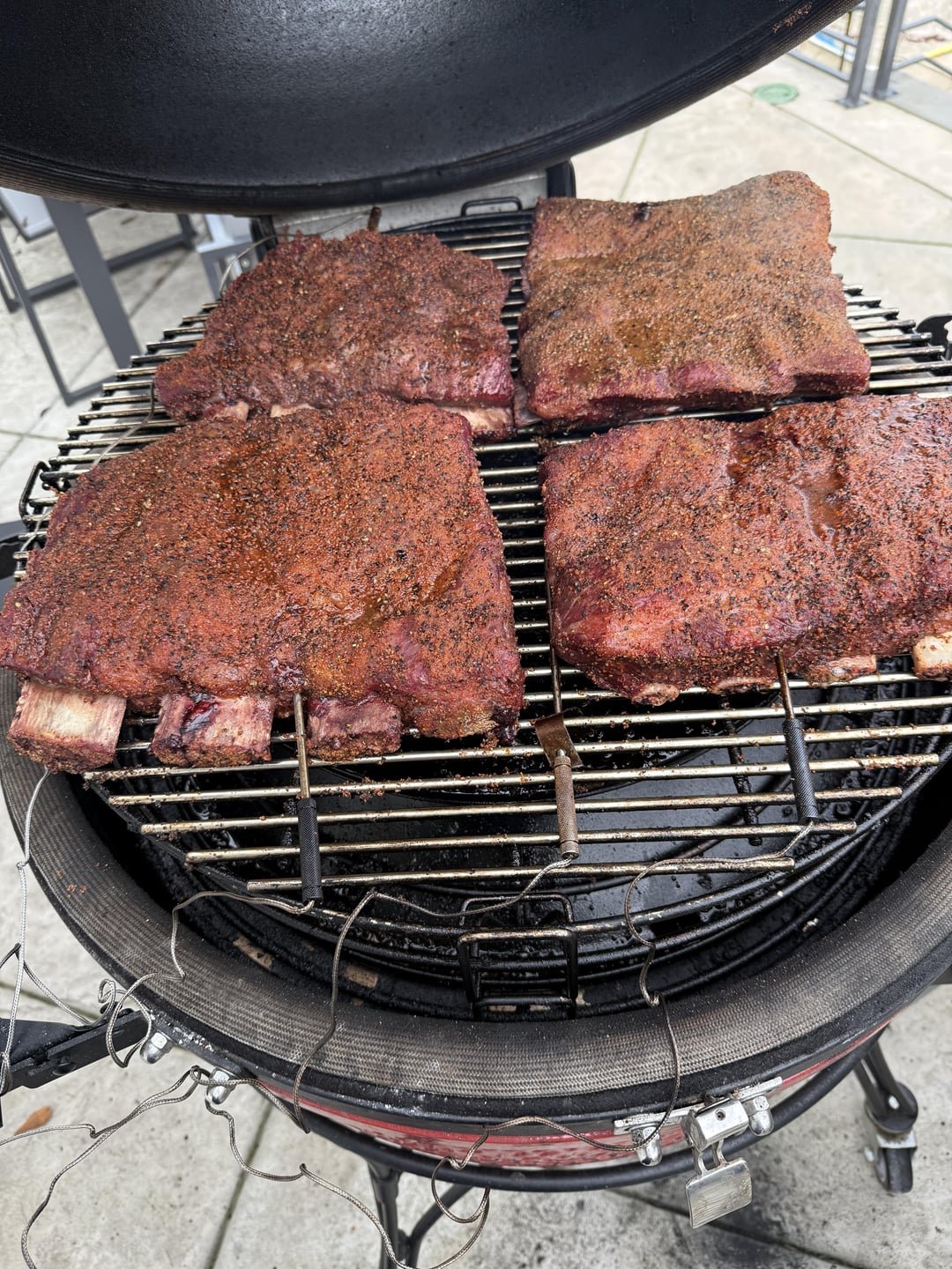 Prime Chuck Beef Ribs from Costco. Dry brined the night before with Diamond Crystal. Coated with meat church holy cow with hot sauce binder 30 mins before cook. Did the smoking dad bbq double indirect with oak and fogo charcoal- kept it around 220 degrees until the end. Crisped up the bark a bit. Cooked to probe tender. They were amazing, Like butter but not quite fall off the bone (the way I like them) with great bark and by far my best yet, but a bit too salty. I will skip the dry brine next time and will not trim off the fat cap (Goldies method). Open to feedback!