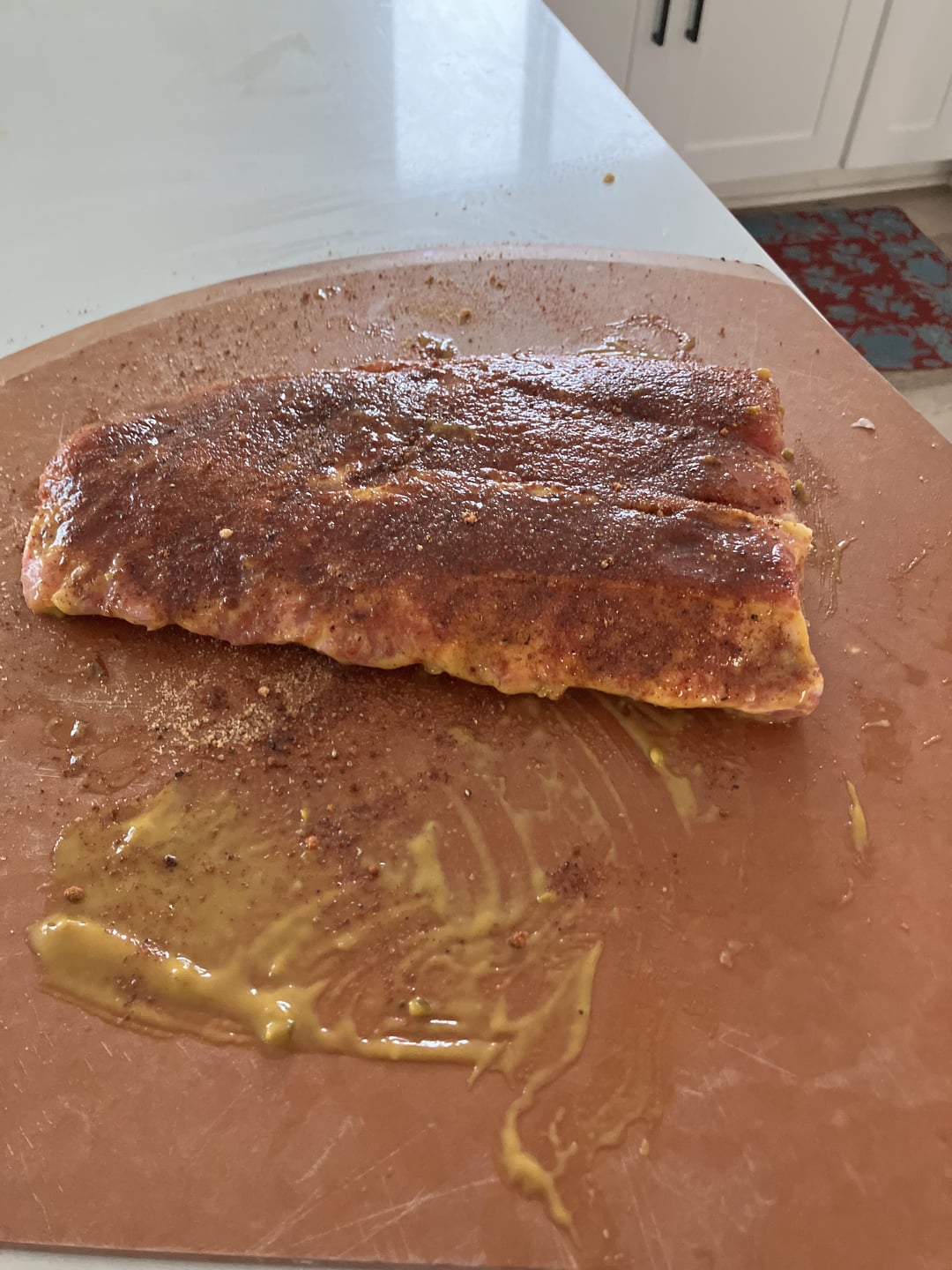 Did a mustard bind, then some Oklahoma Joes seasoning, Peg Leg Porker, and some Meat Church Honey Bacon BBQ.