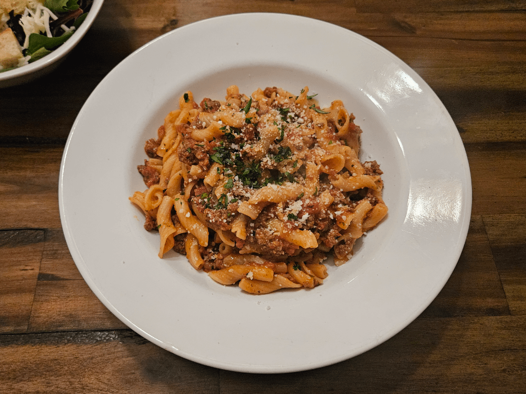 Ground beef bolognese with san marzano tomato sauce, parmesan rind broth & torchiette noodles.