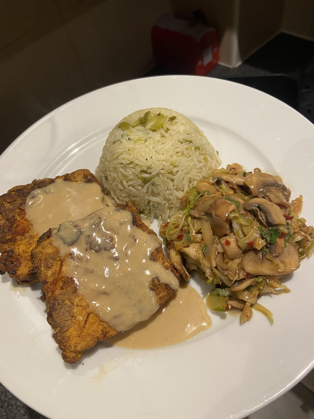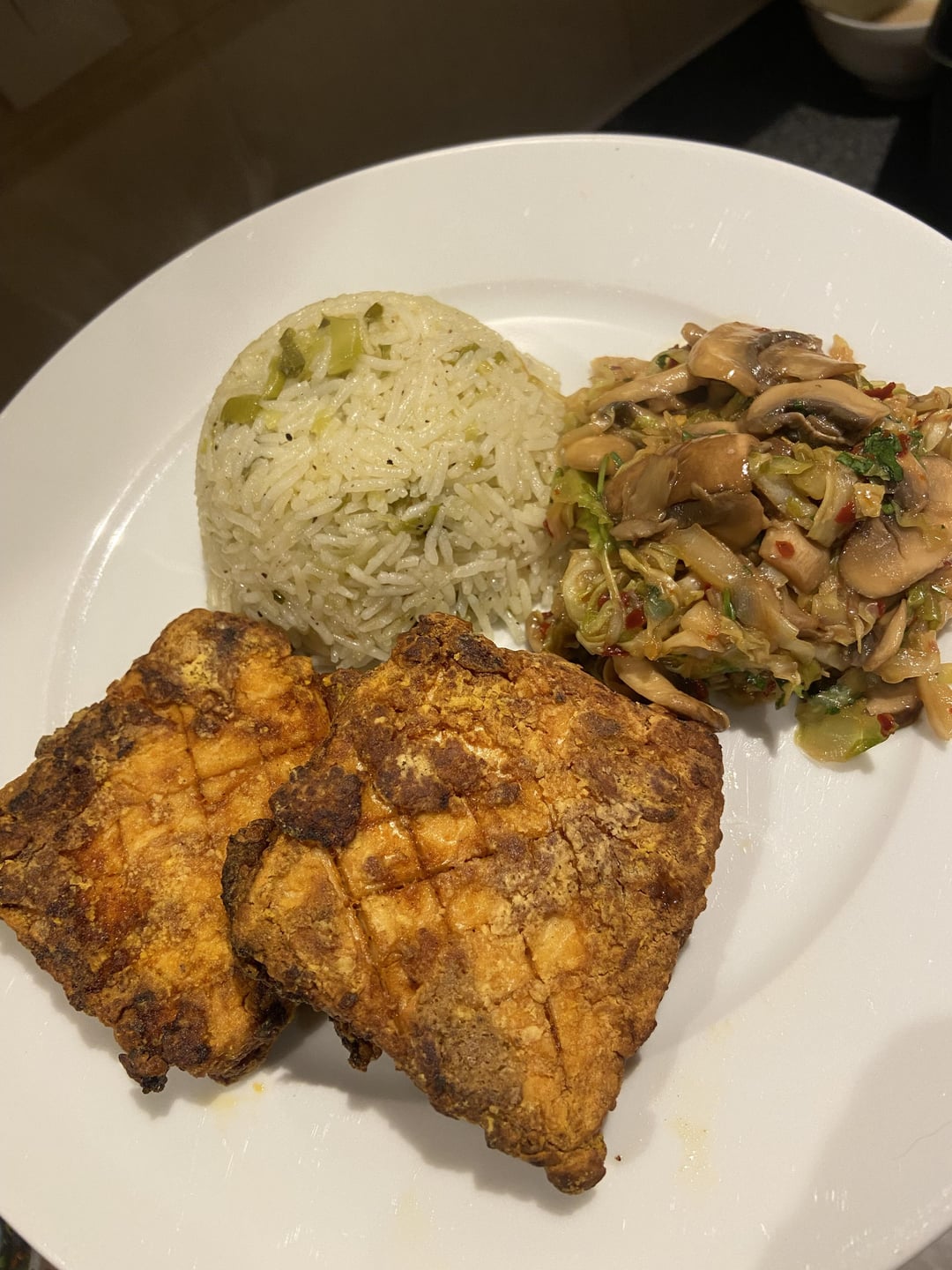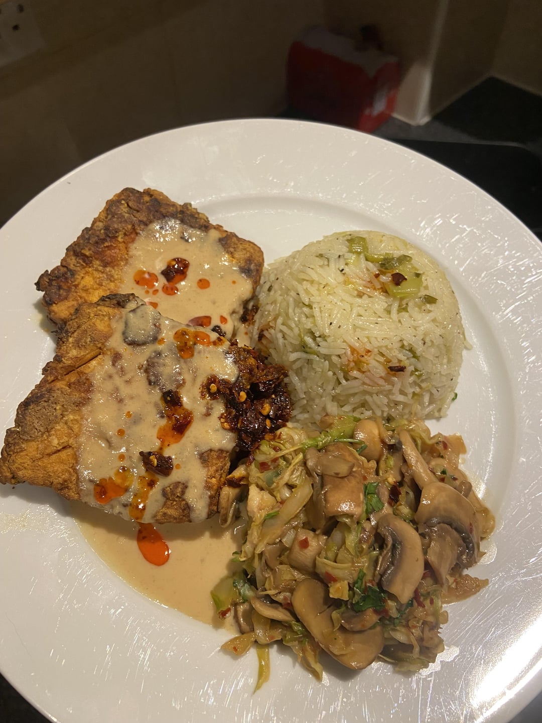 Smokey tofu steaks, with lots of different seasonings to make up the marinade; a tahini sauce (& Lao gan ma (photo dependant)), spring onion (scallion) ‘chicken’ rice & very spicy stir fried cabbage and mushrooms 🙂