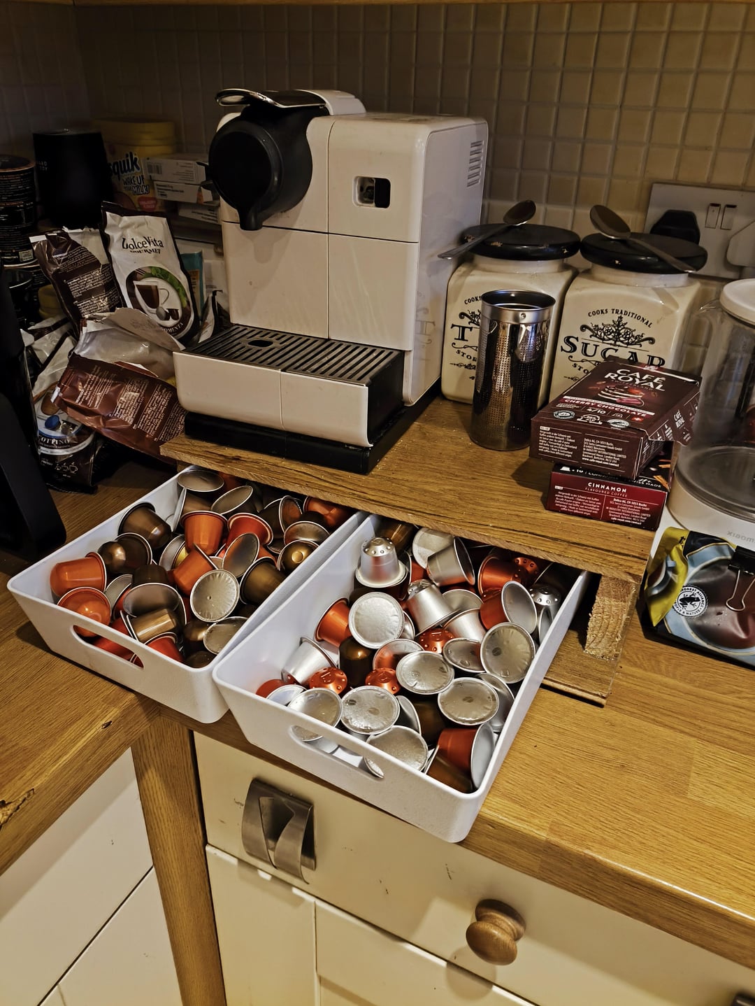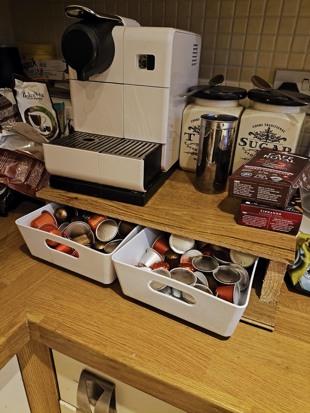 I have 4-5 coffees a day when I'm at home. The result is at least 18 different types of flavour and mixer pods that are both impossible to store neatly, and impossible to identify once they're out of the box (most are off-brand).