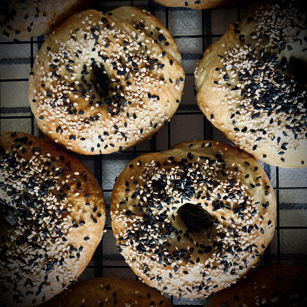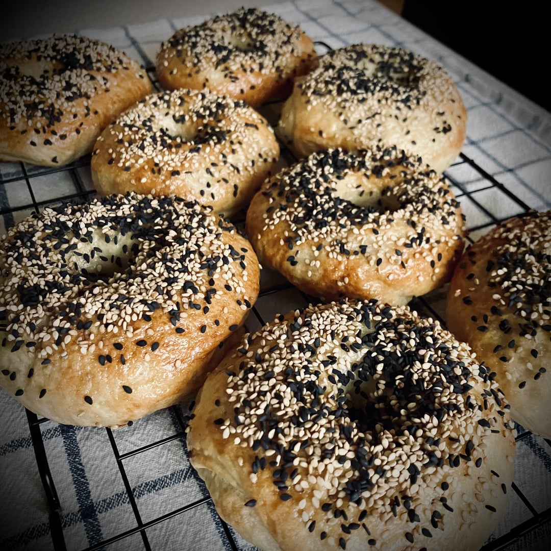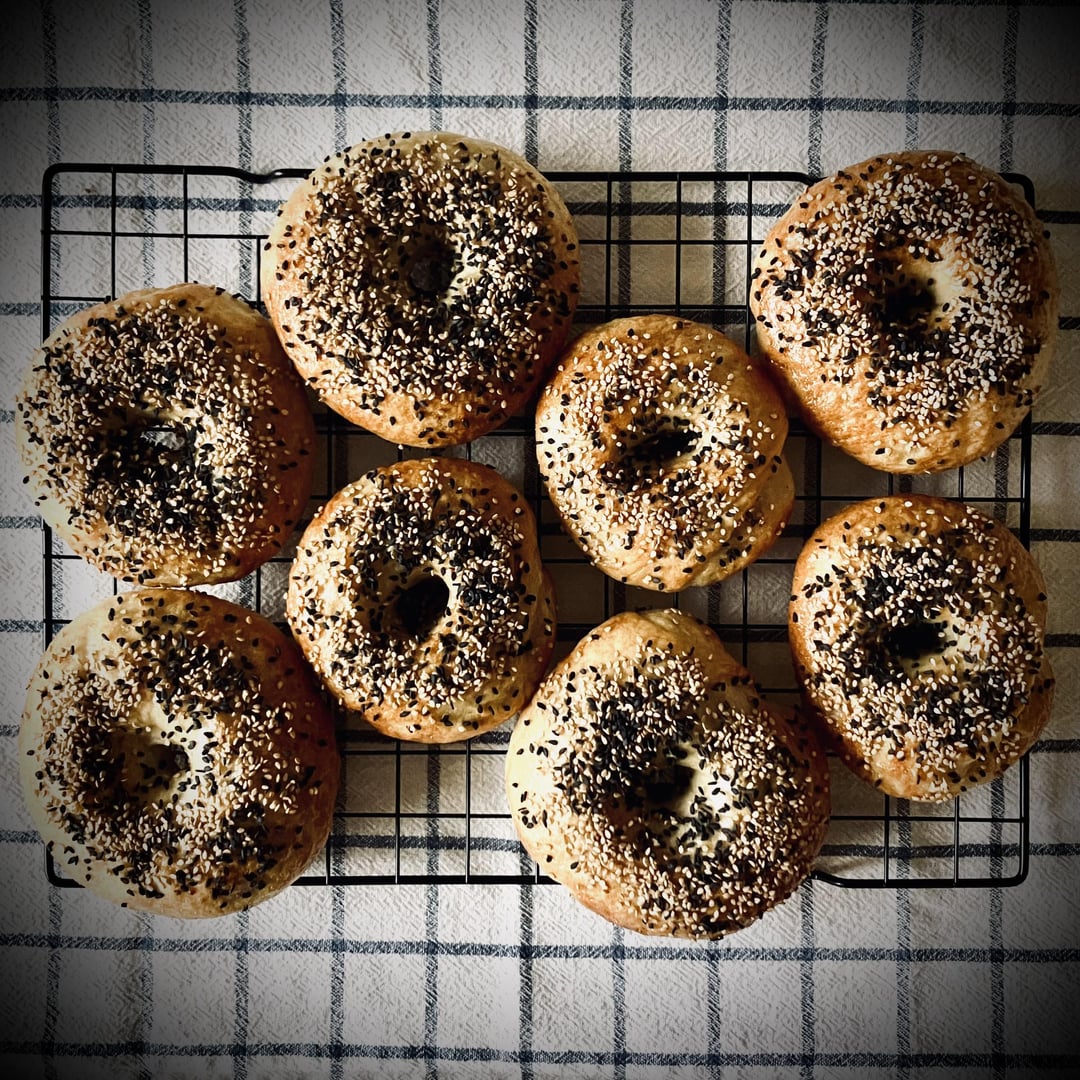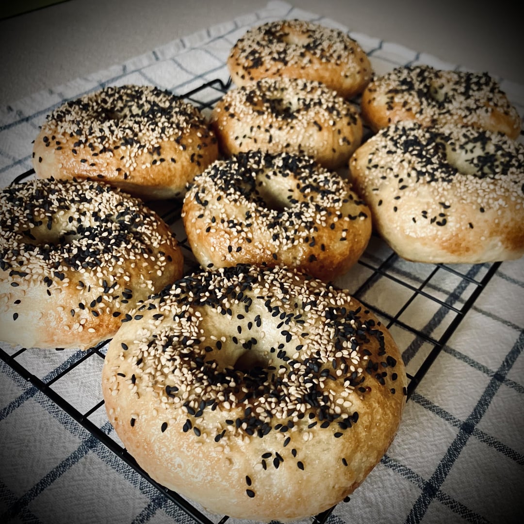 1. add water, yeast, and sugar into a small bowl + mix + let it rest for 10m 2. add flour, salt, and yeast mixture into a large bowl + mix using your hand 3. turn dough out onto a work surface + knead for 10m (until dough has silky smooth surface) 4. place dough in a large oiled bowl + cover with a towel + let it rest for 1hr 5. turn dough out onto a work surface + divide into 8 pieces + shape each into a ball 6. place balls onto a baking sheet + cover with a towel + let them rest for 10m 7. press a floured thumb and index finger through the center of each ball to make a hole 8. boil each ball for 1-2m per side in a pot of boiling water 9. drain and place balls onto a baking sheet + brush with egg wash + sprinkle sesame seeds 10. bake in the oven at 200°C for 20m + take them out and let them rest on a cooling rack
