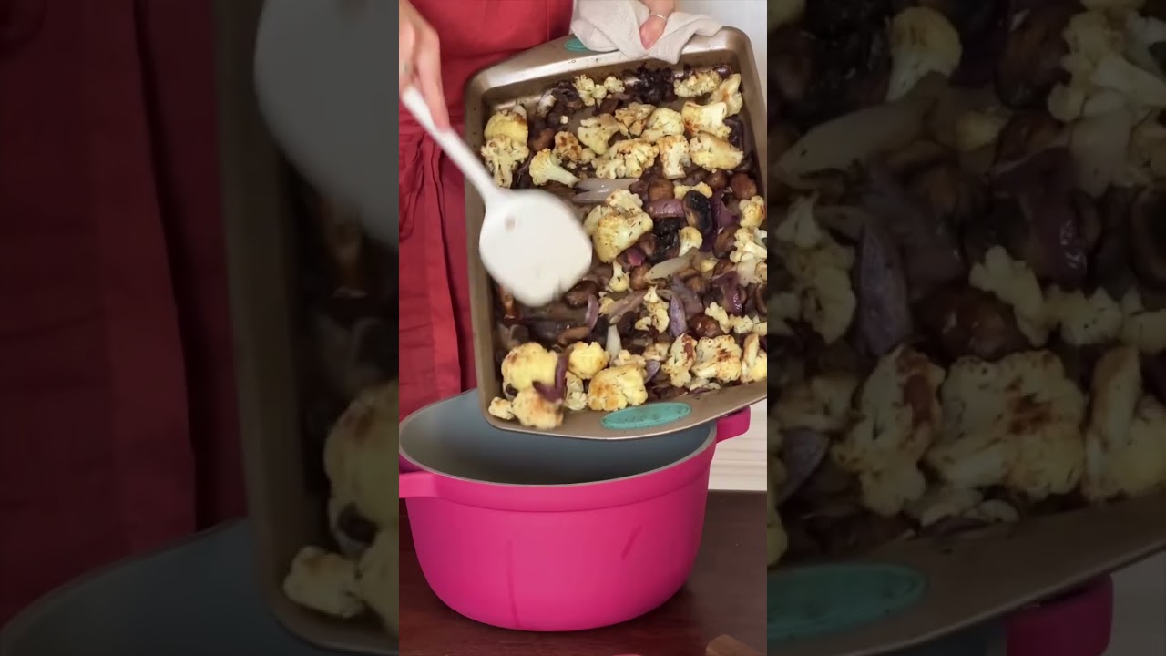 * In a large mixing bowl, combine cauliflower florets, halved cremini mushrooms, quartered red onion, and halved shallots.