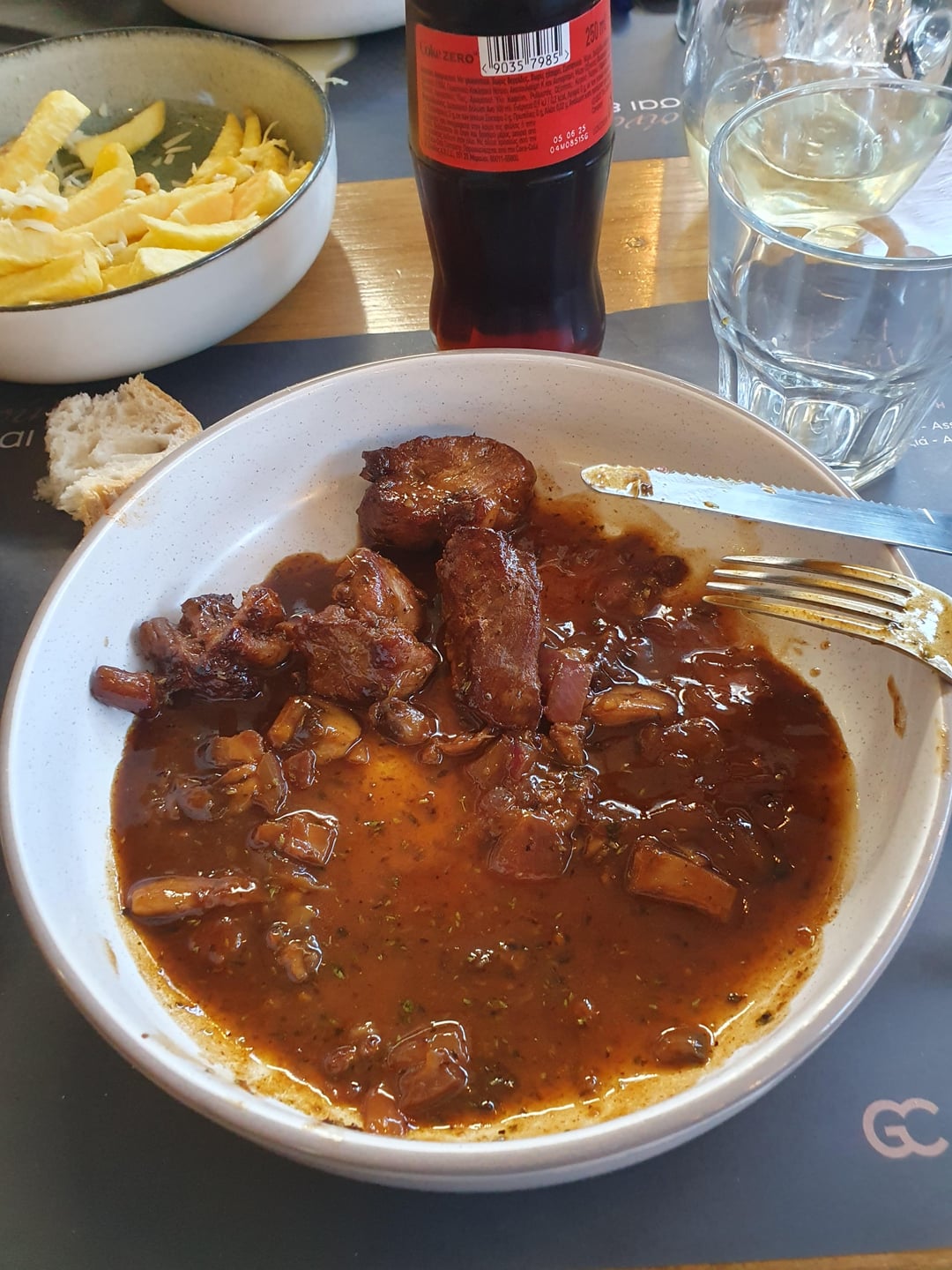 Im pretty sure this is boar meat (pretty fatty), with mushrooms and onion, in a rich red wine sauce, definetly has a lot of oil. Second picture is what I didn't eat. I would greatly appreciate a breakdown of everything. Did I consume 1000 or 1200, or more? That's my guess. Thanks in advance!!