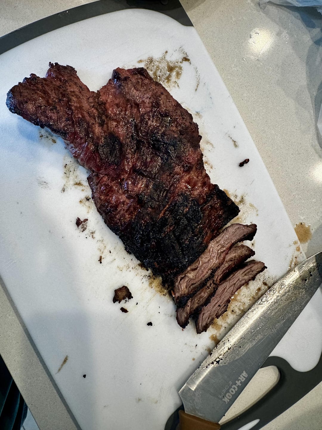 Looks delicious! Tip from a true amateur… cut it the other way, against the grain. Makes it far more tender.
