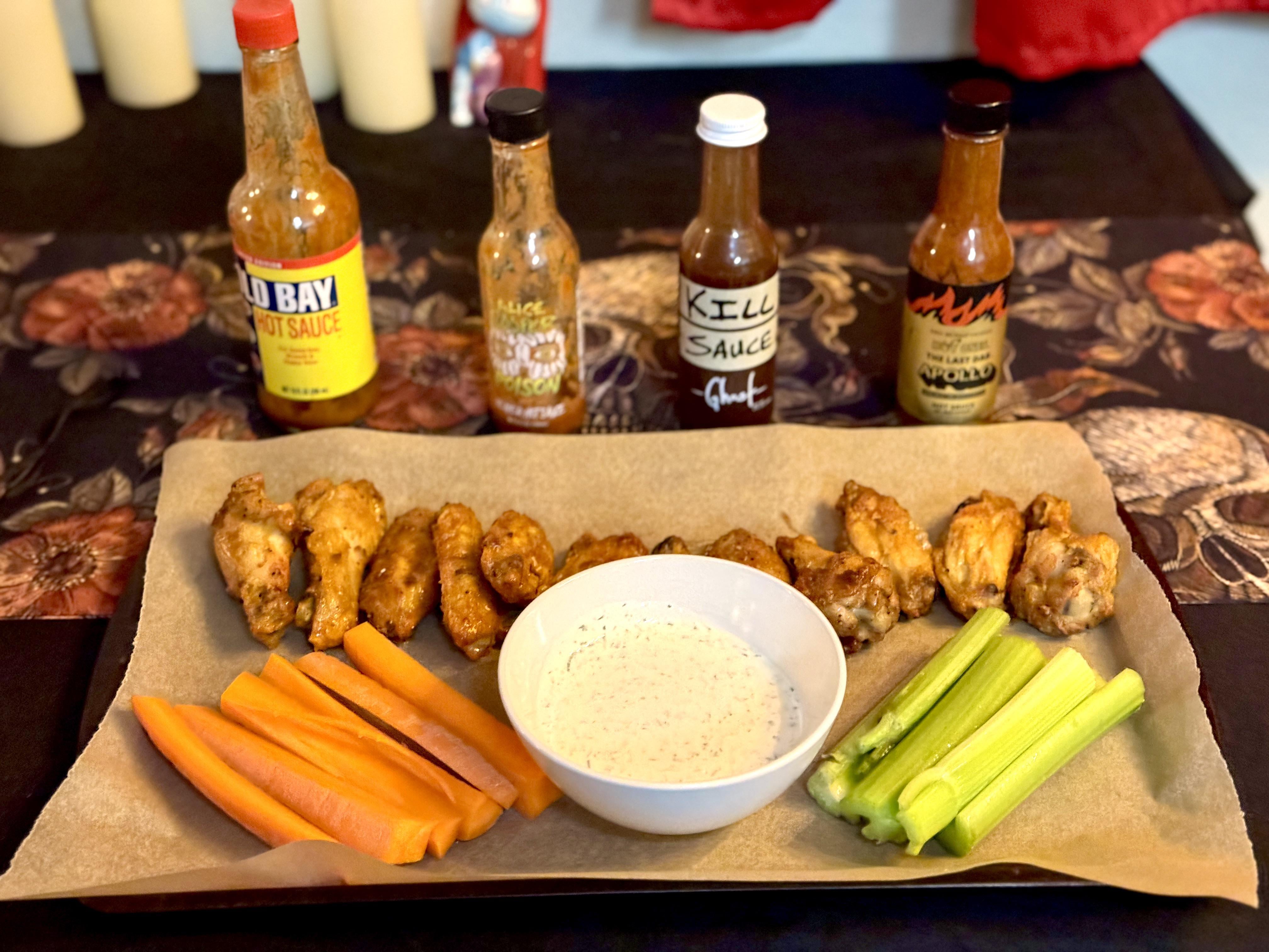 Tossed 3 each in the above sauces. Made the ranch from scratch too!by thecaptainllama Write A CommentYou must be logged in to post a comment.
