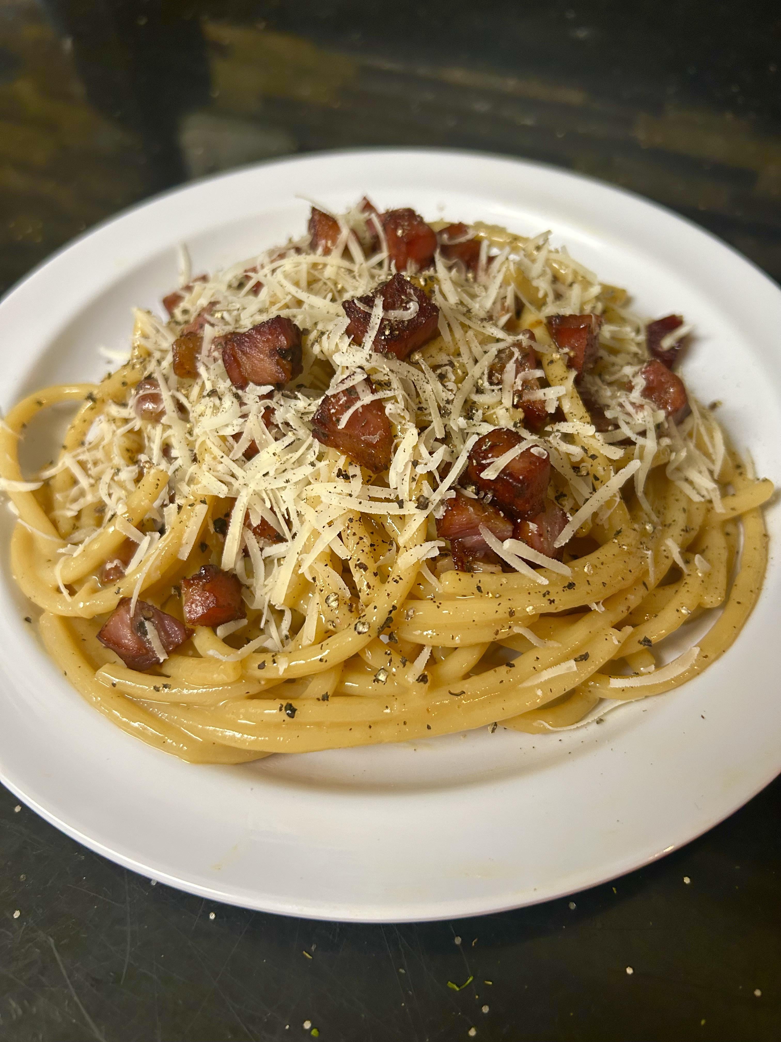 Used bucatini pasta. A mix of pecorino ramano cheese along with Parmesan. And got some thick sliced pancetta from the deli because I don’t have access to guanciale.by Matter_Baby90 2 Comments Separate_Virus_4533 9 months ago That looks sooo good TheKingPooPoo 9 months ago Buy new bucatini not used!Looks friggin good 👍 Write A CommentYou must be logged in to post a comment.