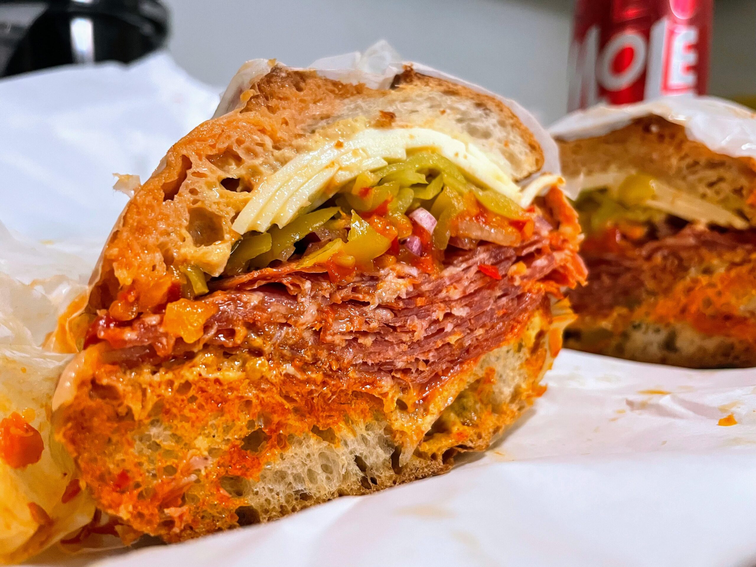 Hot Salame with Provolone Cheese, Dijon, spicy Calabrian chili spread, red onion, pepperoncini, mild Italian peppers, oil and vinegar on Acme Italian Roll