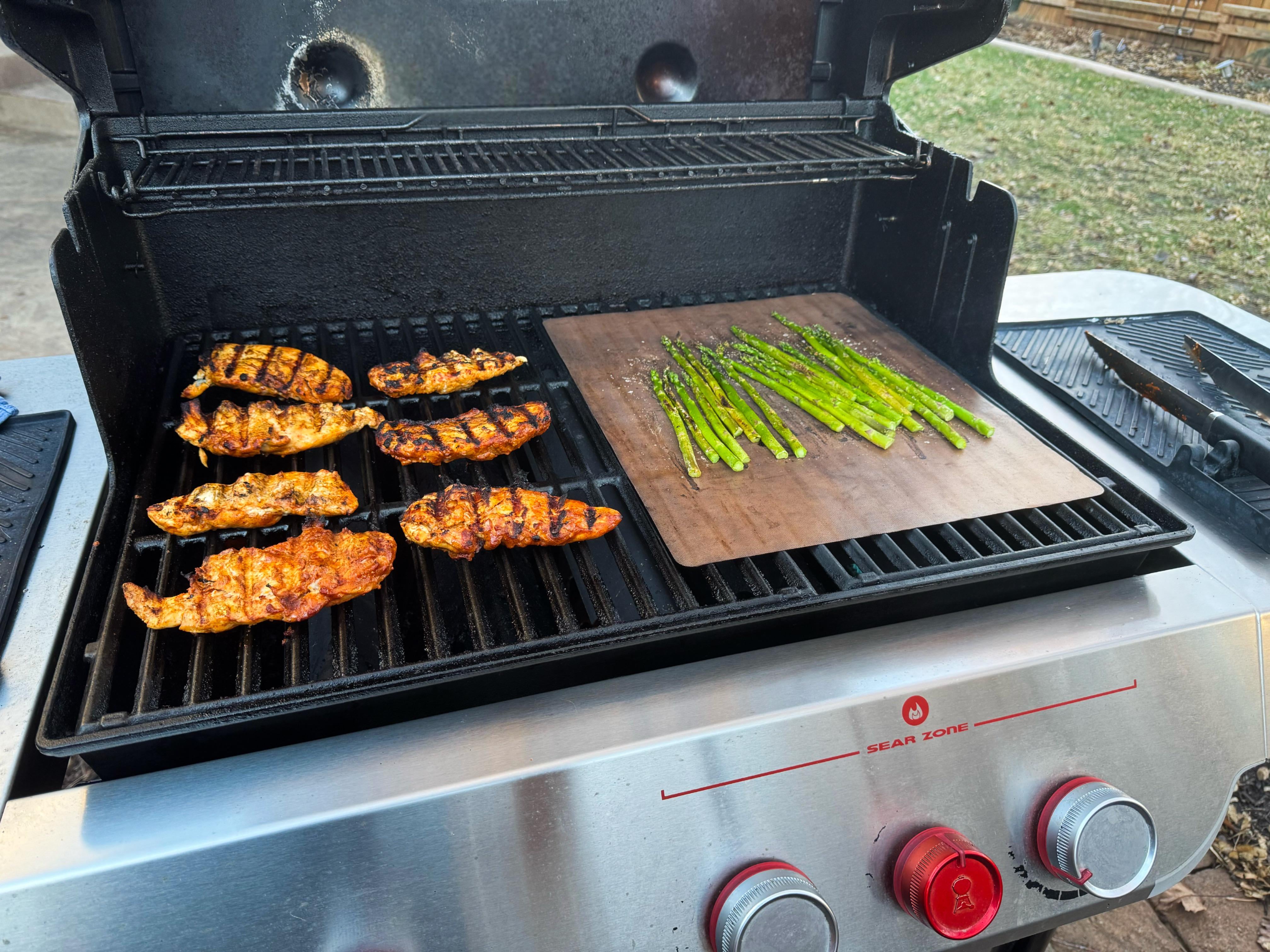 A few Chicken Tenders marinated in Chicken Tinga Seasoning and Asparagus.