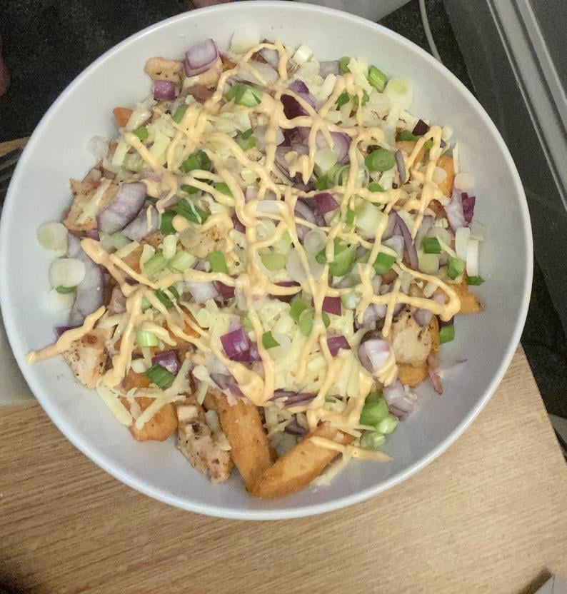My own seasoned chicken with red onion spring onion crispy bacon and mature cheddar cheese on triple cooked chips with perinaisse sauce. Thoughts?