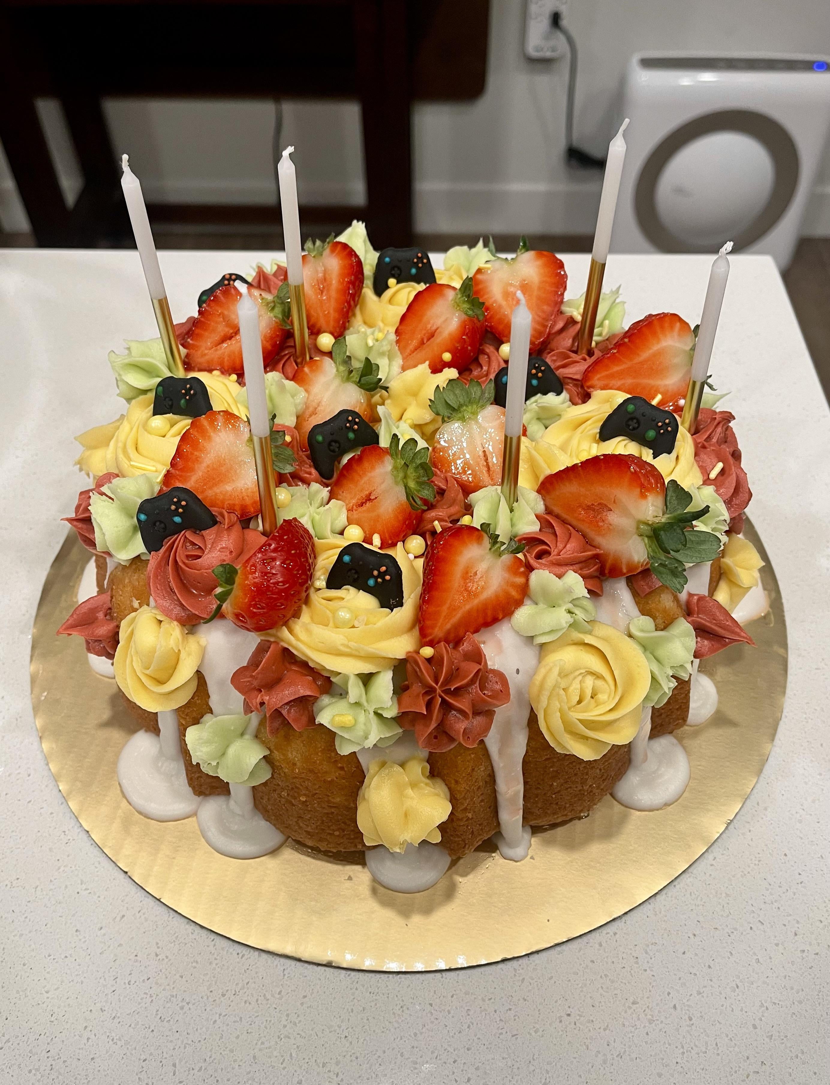 It’s lemon Bundt cake with lemon glaze and cream cheese frosting and strawberries. Hope I did him proud!