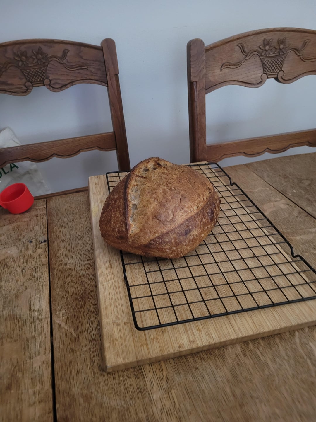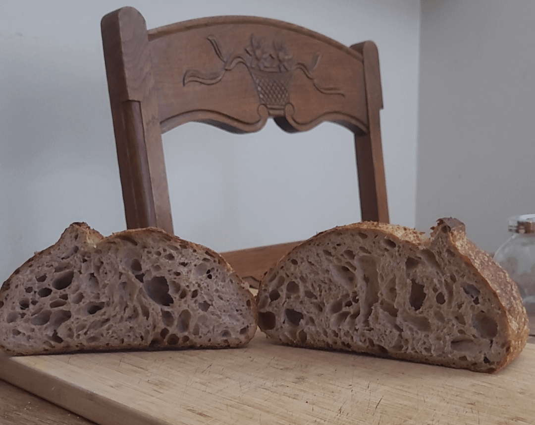 I had intended to make a loaf with 60/40 white and whole wheat flour but ended up running out of each so filled the rest with spelt. Have never made a loaf with such a wild crumb with that much whole grain!