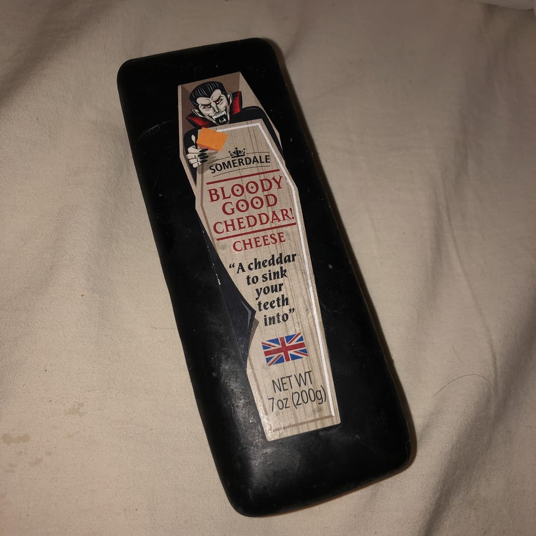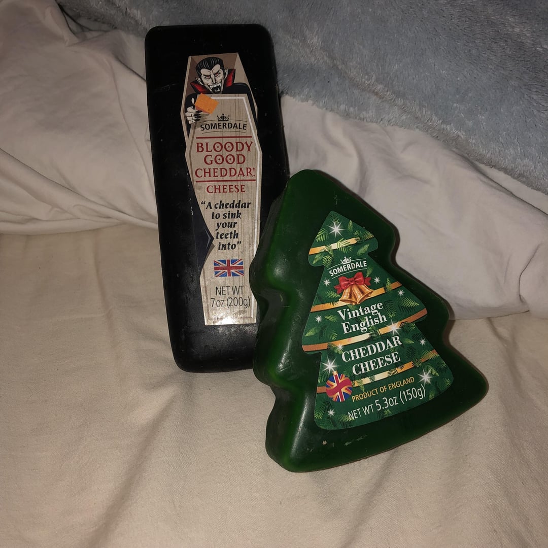 We fell in love with Bloody Good Cheddar last year, and bought as many of the black coffins as we could find this year. Now we’re about to try this delightful little Christmas cheddar!