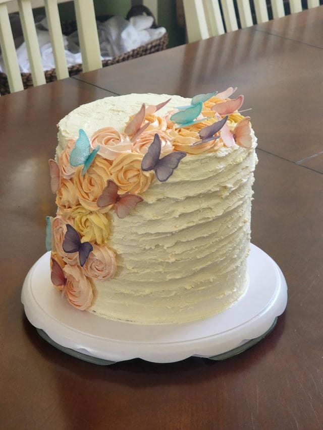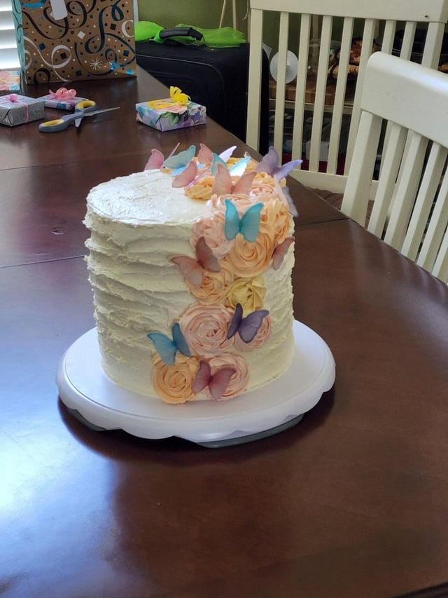 For my birthday my mom wanted to try making my favorite cake (yellow cake with chocolate icing) as a surprise for me, she made the chocolate mousse from scratch as the filling too. I thought it looked amazing and she was excited because it was her first time making a cake this fancy 🥹 The butterflies where even edible (sugar paper kind of bland tho hahaha)