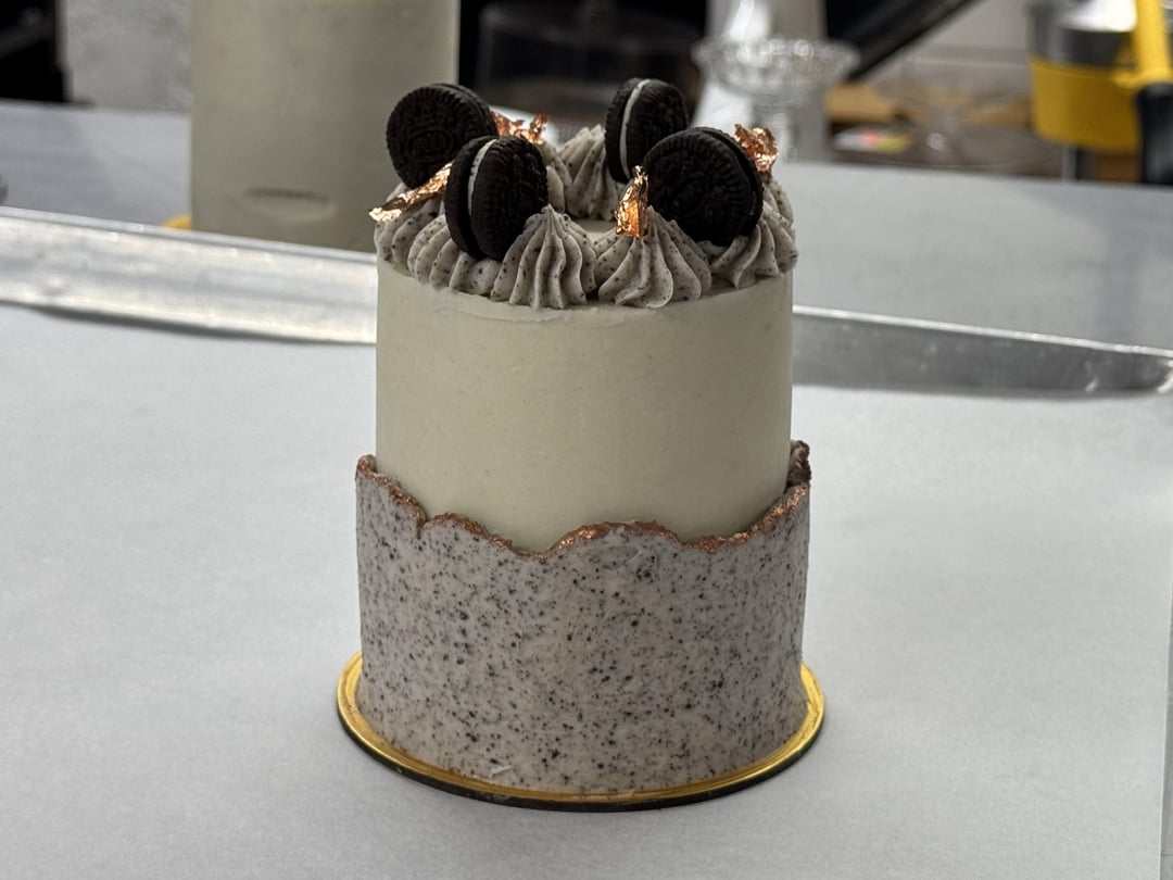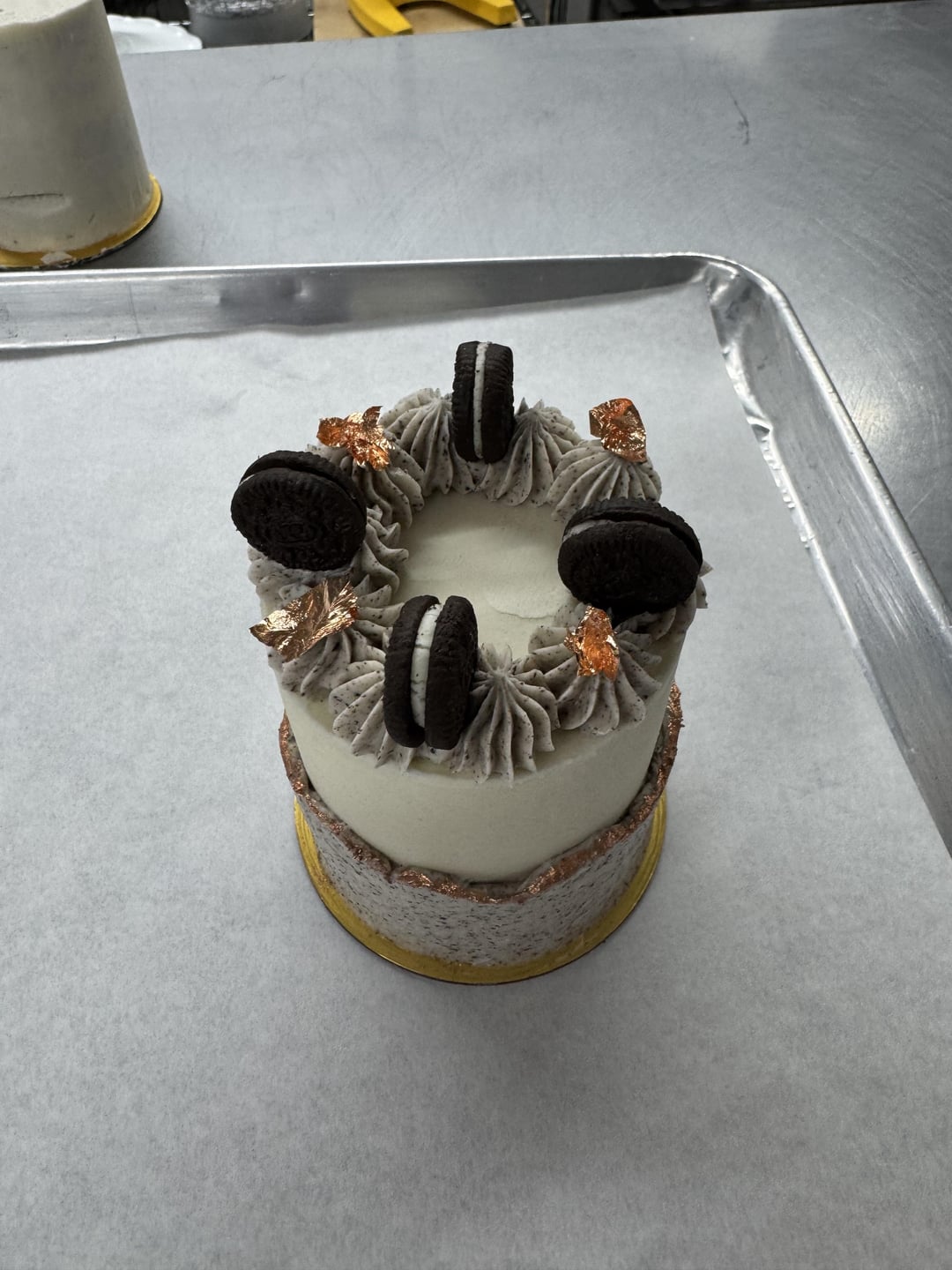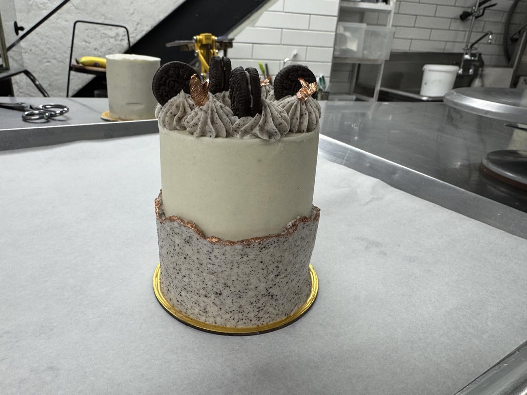 My piping still needs work. Do you think the buttercream coating is thick enough? I feel like I can see through to the Oreo cake inside. And I’m just now seeing the lip on top of the cake. 🤦🏻
