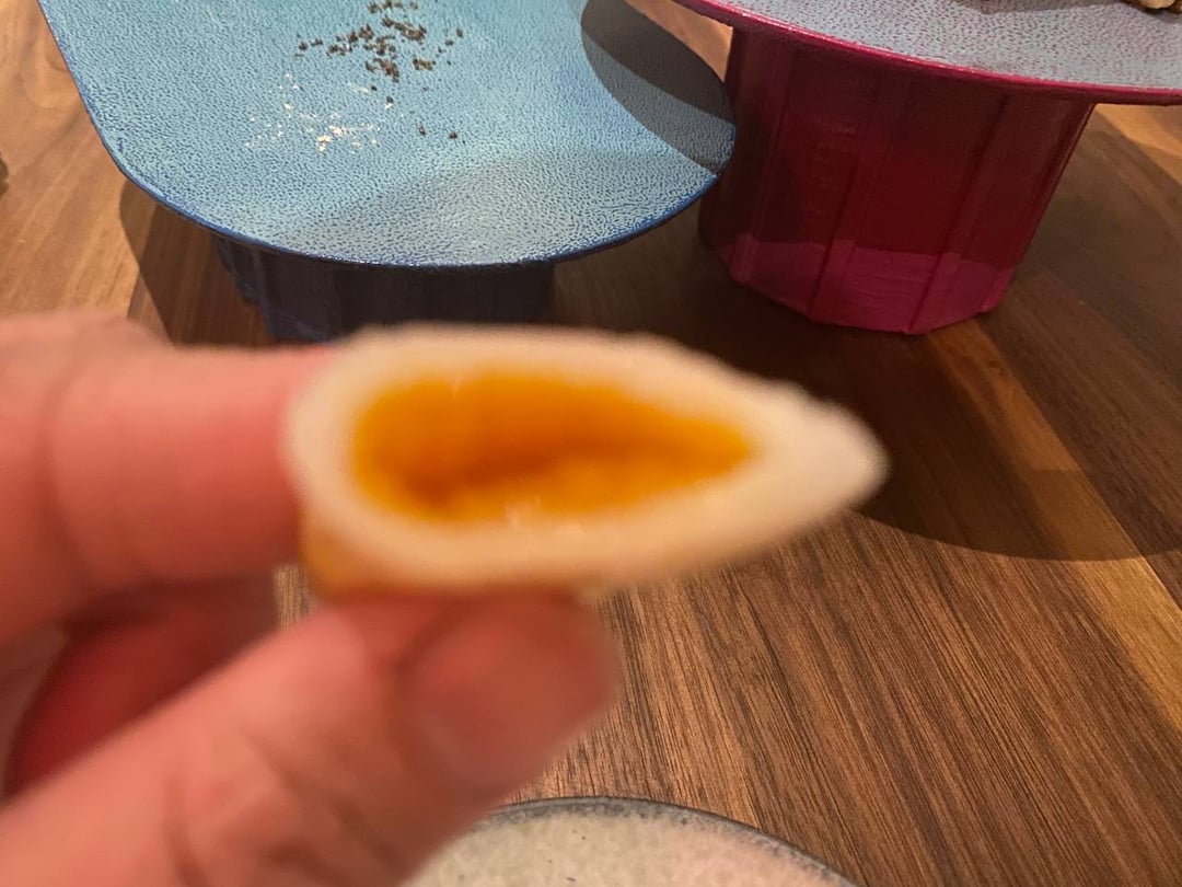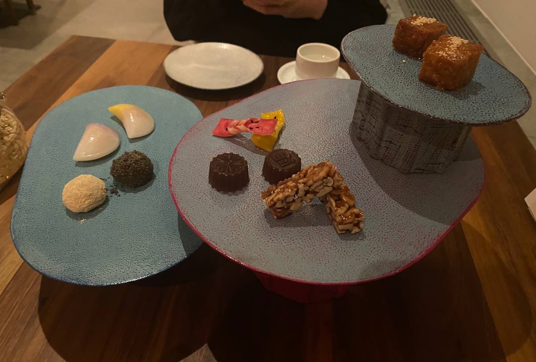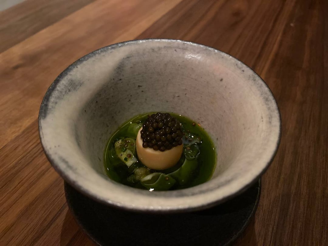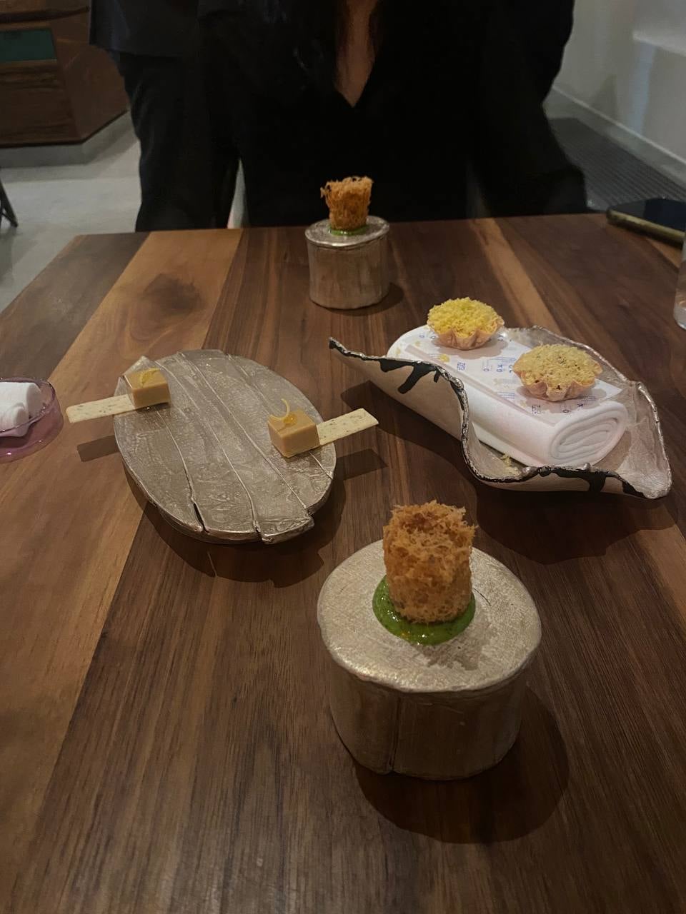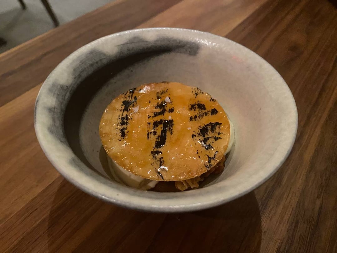 1. Ganjang- the bite is a fried piece of soft taro with a mild chicken interior with a green sauce on the bottom. The taro is earthy,sweet, and super soft, almost mashed and the chicken is tender. The sauce on the bottom is almost like a chimmichurri using perilla leaf. The “whisps”” are perfectly crunchy and dissolve nicely. It reminds me immensely of a Chinese dim sum dish that uses taro and meat called Wu Gok both in taste and presentation, albeit with a Korean twist. Good bite, don’t taste the ganjang (soy sauce) in it though. 2. Gochujang-basically a tartare tartlet using a crispy wonton wrapper as the base. A super savory and creamy beef tartare with a sprig of green onion and almost a “spicy mayo” on the bottom that uses Gochujang for the spice. The tartare almost tastes like how Korean bbq joints smell, in the best way possible. Very tasty. 3. Deonjang-literally melt in your mouth foie gras mousse with almost an initial hit of wine (which I’m assuming is actually the doejang) with a finish of citrus at the end. The cracker is almost like the ultimate fine dining version of a Ritz cracker with a bit of sweetness to it. Holy fuck, this was amazing. Perfectly done.