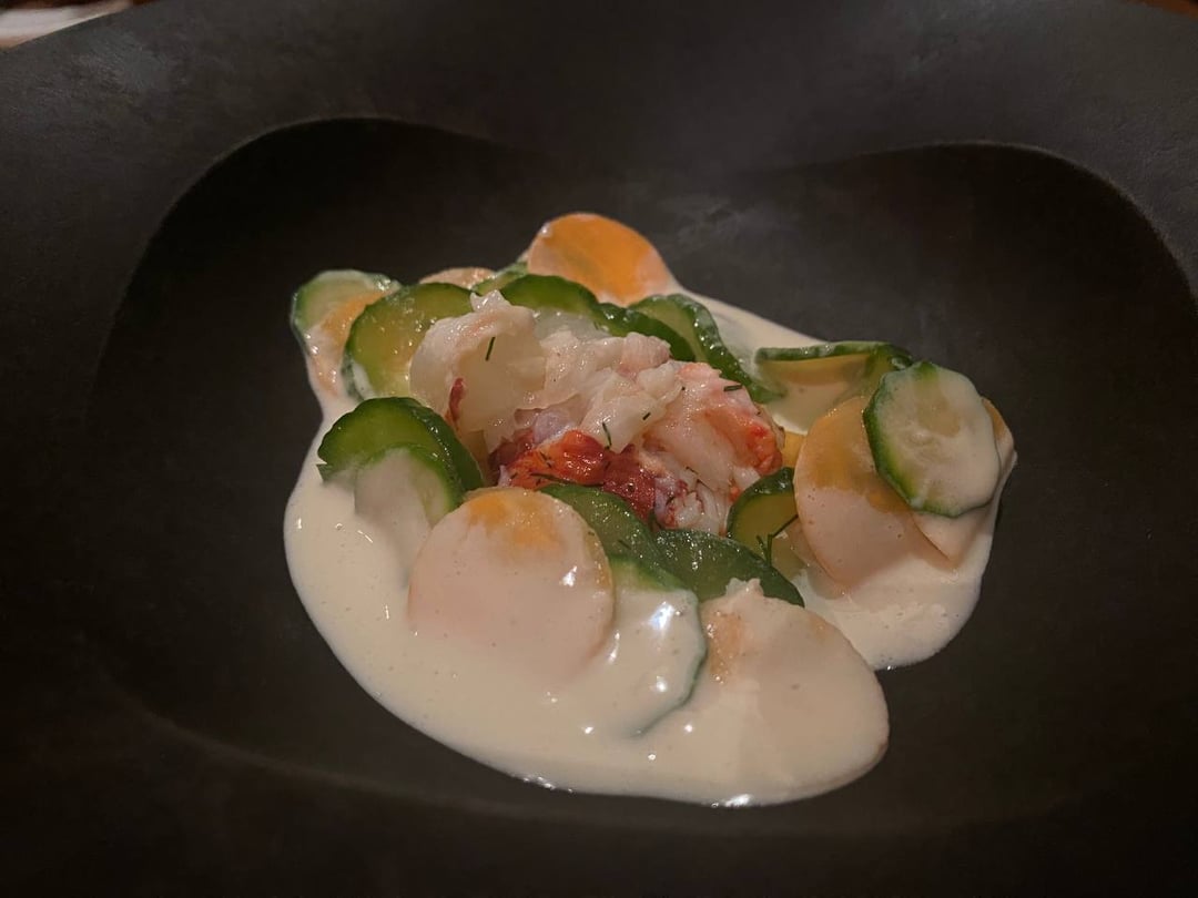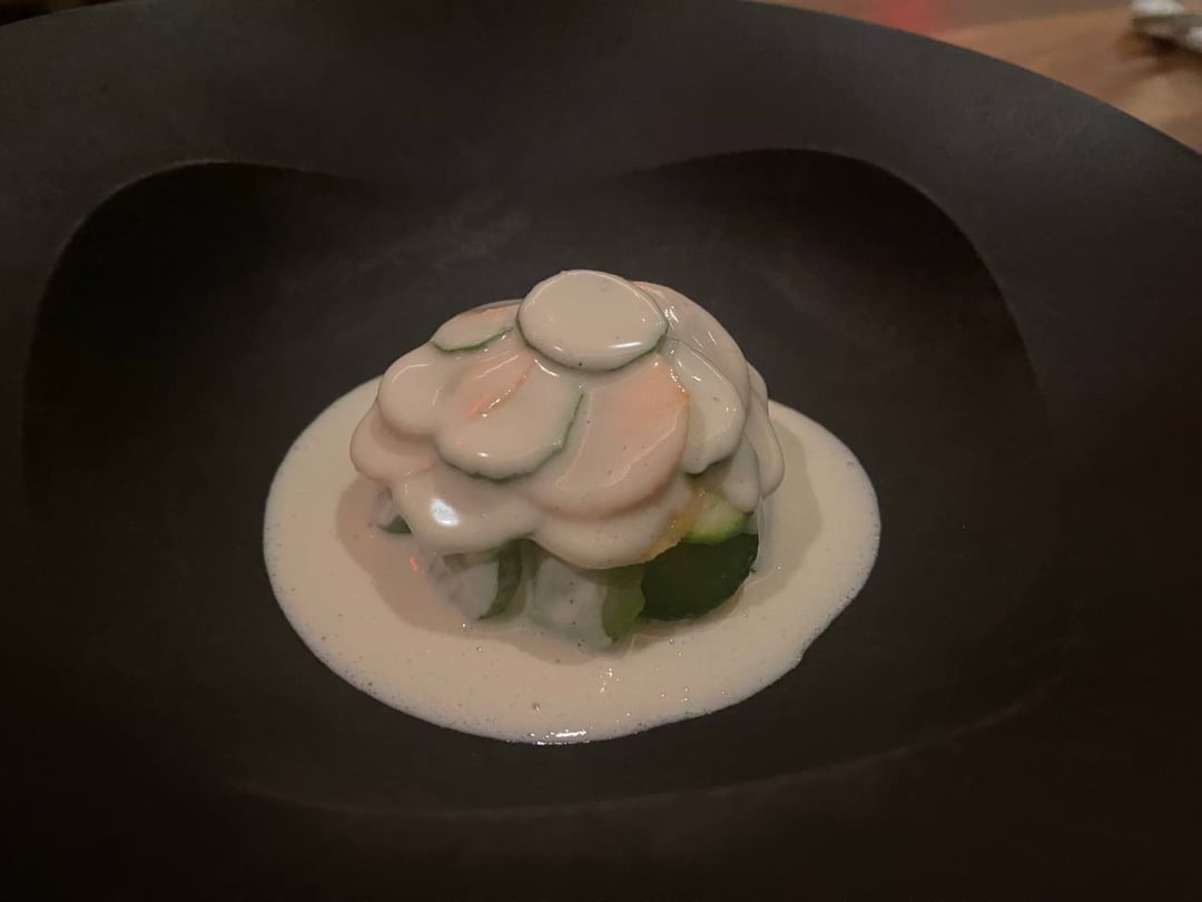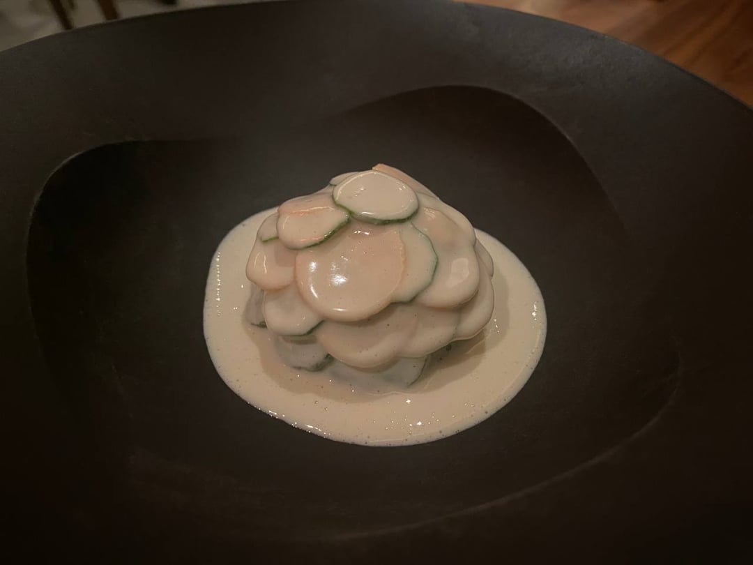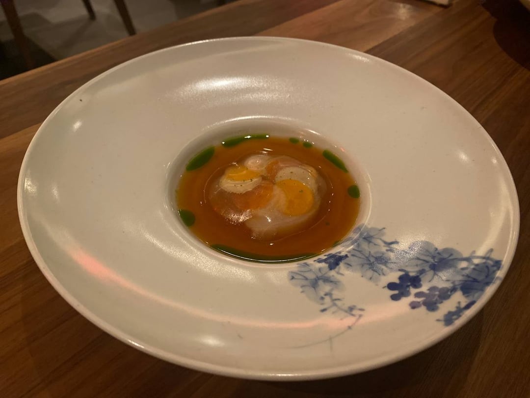 Jang Mool Hoe- a translucent dumpling skin filled with squid, scallop, uni, persimmon, and butternut squash. The dish itself is beautiful. The sweetness of the squid and scallop comes out super well and so does the uni’s richness with a hint of brininess. The crunch of the persimmons is there but I wish the sweetness of the squash came out more. The soup it’s in reminds me of naengmyon broth with an earthy bitter note added to it.