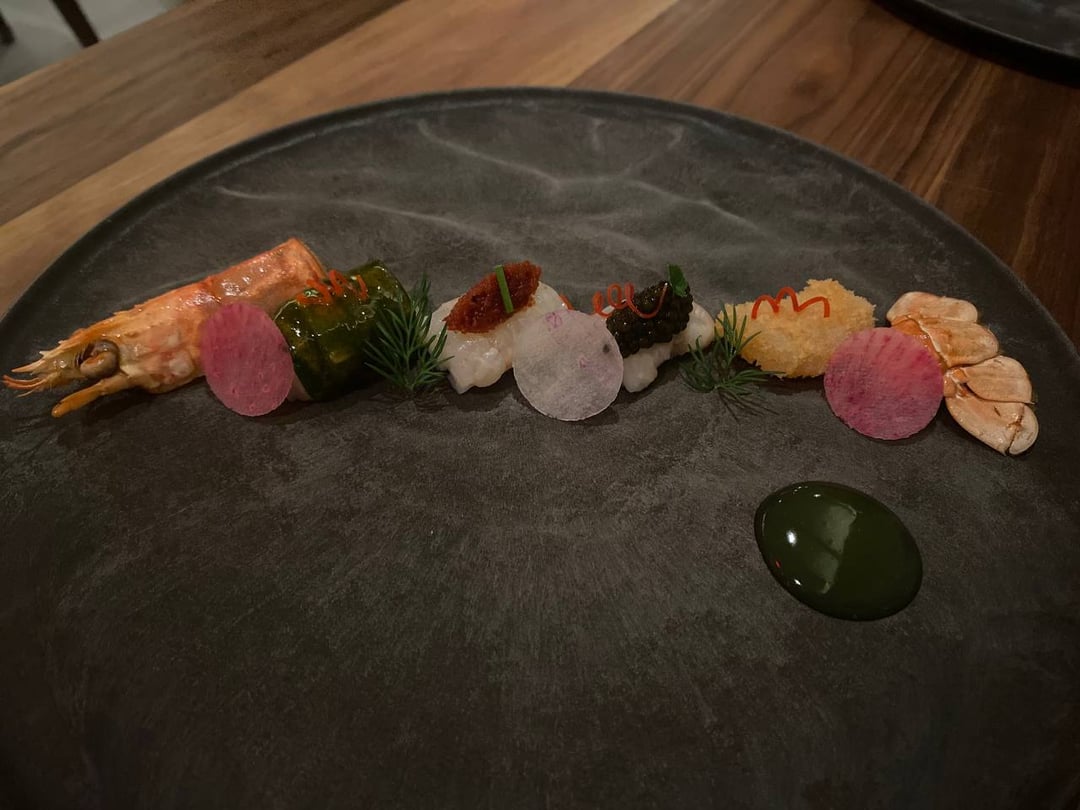 Langoustine prepared 4 ways (from right to left)- 1.wrapped with langoustine threads- 2.topped with osetra caviar- 3.topped with pickled herring roe- 4.wrapped in pickled scallion leaf
