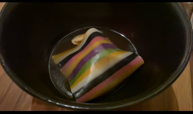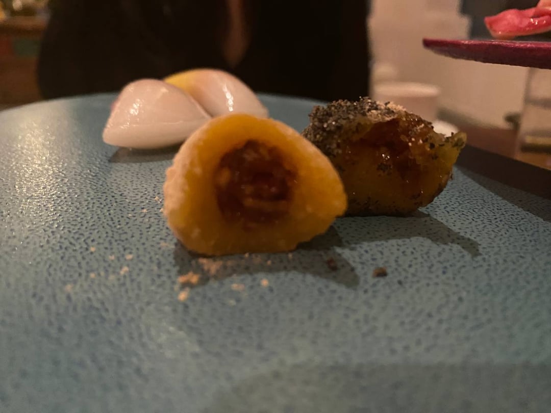 1. Ganjang- the bite is a fried piece of soft taro with a mild chicken interior with a green sauce on the bottom. The taro is earthy,sweet, and super soft, almost mashed and the chicken is tender. The sauce on the bottom is almost like a chimmichurri using perilla leaf. The “whisps”” are perfectly crunchy and dissolve nicely. It reminds me immensely of a Chinese dim sum dish that uses taro and meat called Wu Gok both in taste and presentation, albeit with a Korean twist. Good bite, don’t taste the ganjang (soy sauce) in it though.