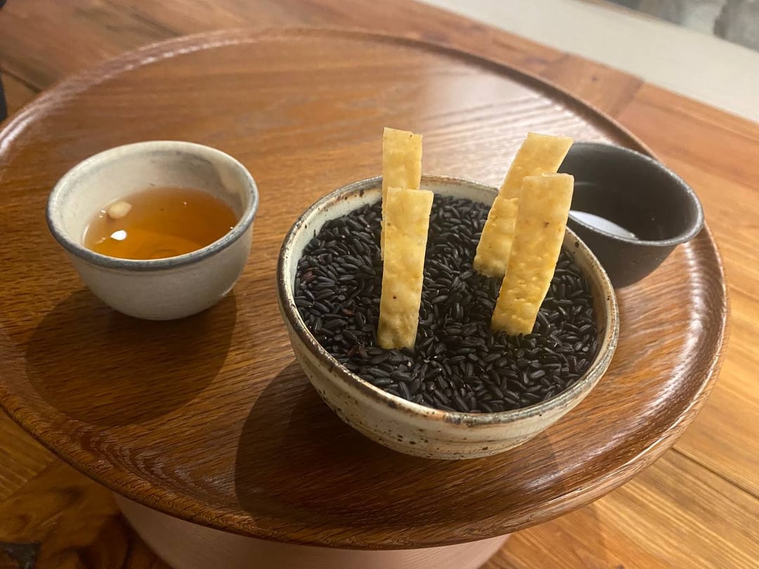 In the lobby: Intro Snack: Hawthorne Tea intro with “Crisps”- the tea is sweet and acidic with a tart note at the end, very similar flavor profile to raspberry except with a tinge of sourness at the end. The cracker is almost like an elevated version of the fried crisps you get with Chinese takeout, except more delicately fried along with a good hint of dried baby shrimp flavor. Almost like a shrimp cracker.
