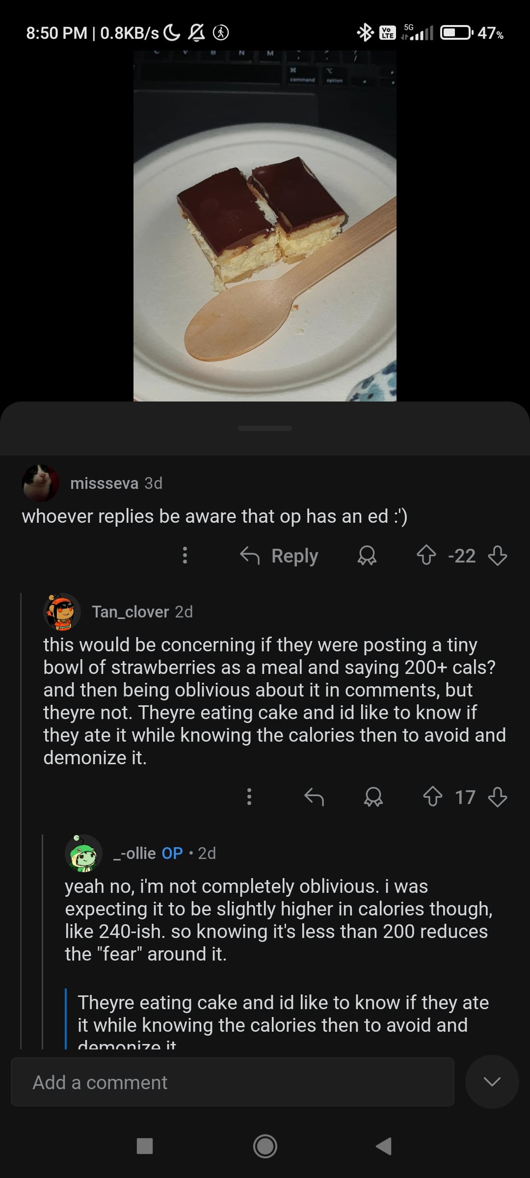 Better to eat something than nothing. They don’t care about anybodies ED, they care about not letting someone “be skinnier than them”. I know I’ll get attacked for saying it but that’s the truth and we all know it. You shouldn’t be discriminated against because of a disease. I’m sorry you had to deal with this, OP 🩷