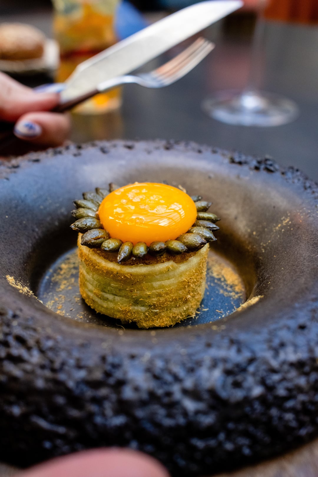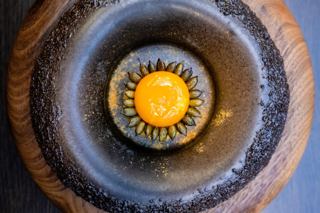 -*Marigold “egg” caviar, 15 grams “2020”. One of the dishes that convinced me to go to De Librije, at 75 euros (each) it came beautifully presented and cutting the egg was so satisfying and made for an awesome video but to be honest we were disappointed with the flavor, it was bland. This was the only letdown of the meal and I wished we hadn’t order one for each of us. Feeding “marigold” to chickens is a common thing in my country, so there was no novelty here for us.