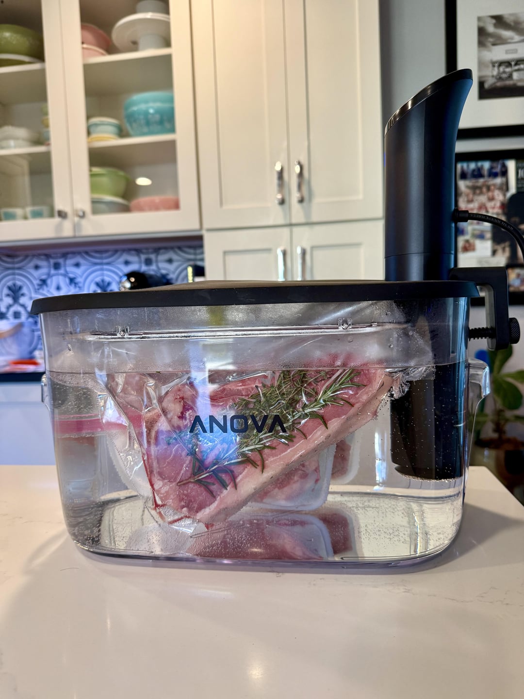 Finally busted out my Anova mini. Did three bone-in NY Strip steaks with thyme and rosemary, 3 hours at 130 degrees. Finished with a 60 second sear on a blazing hot cast iron pan.