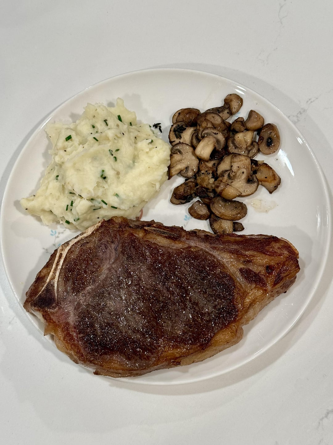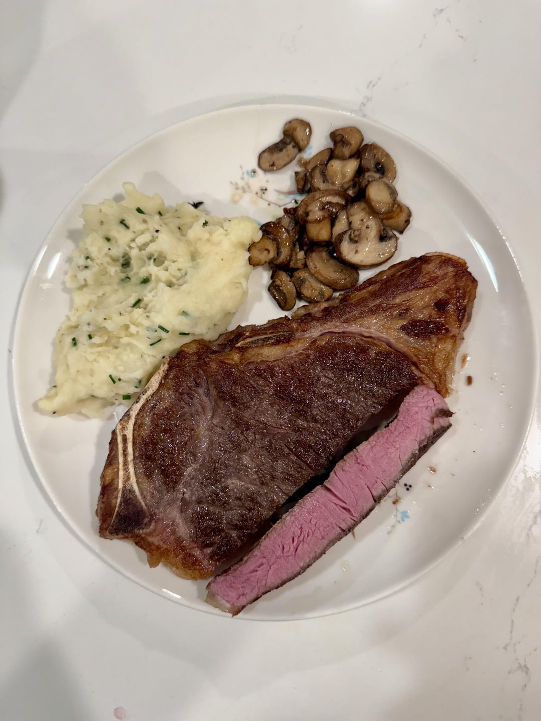 Paired with creamy garlic mashed potatoes and sautéed mushrooms in a white wine reduction.