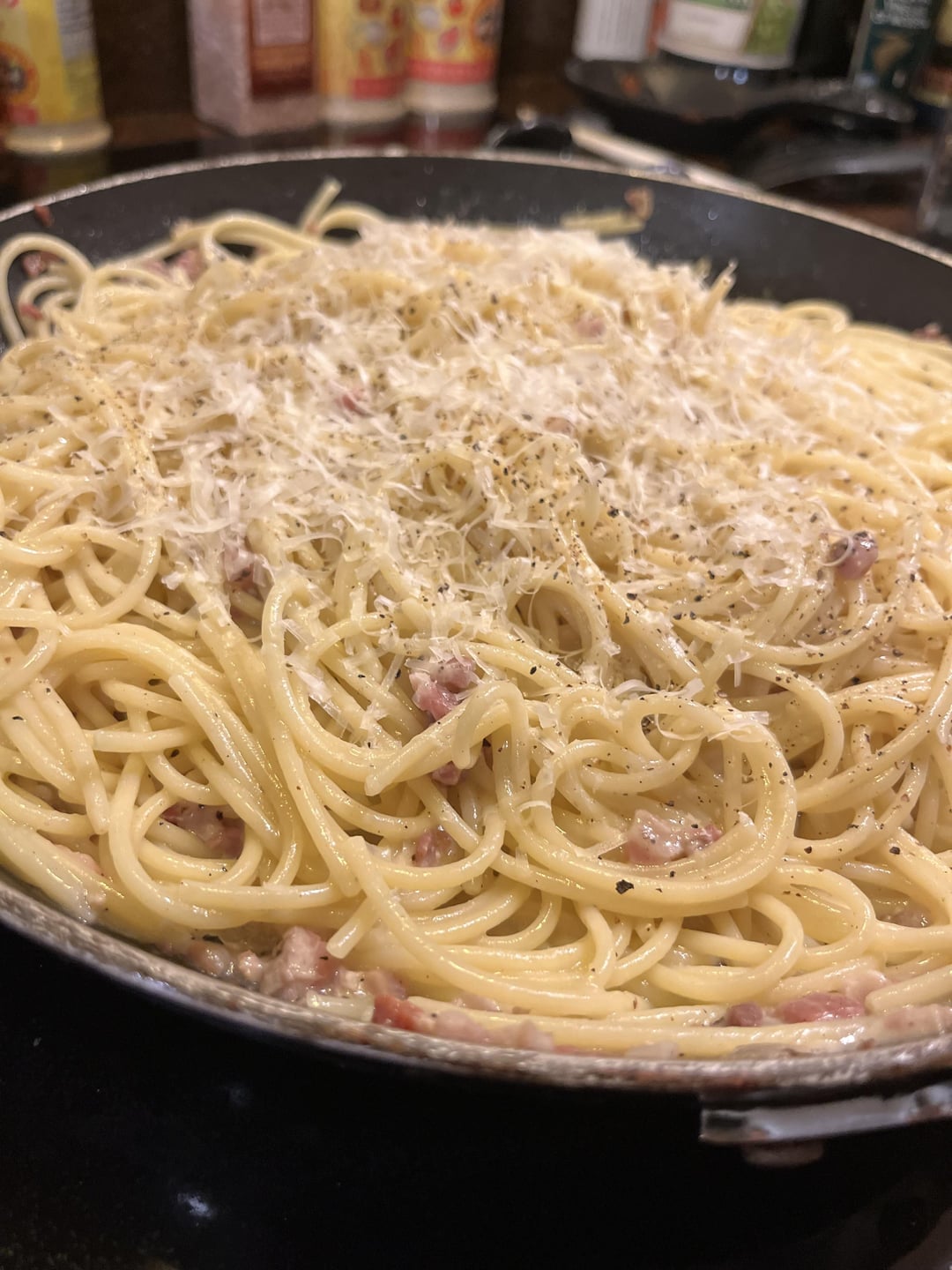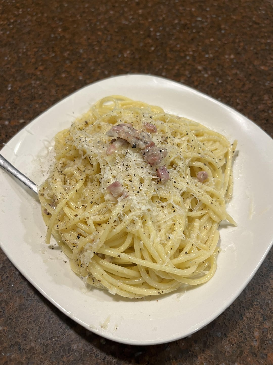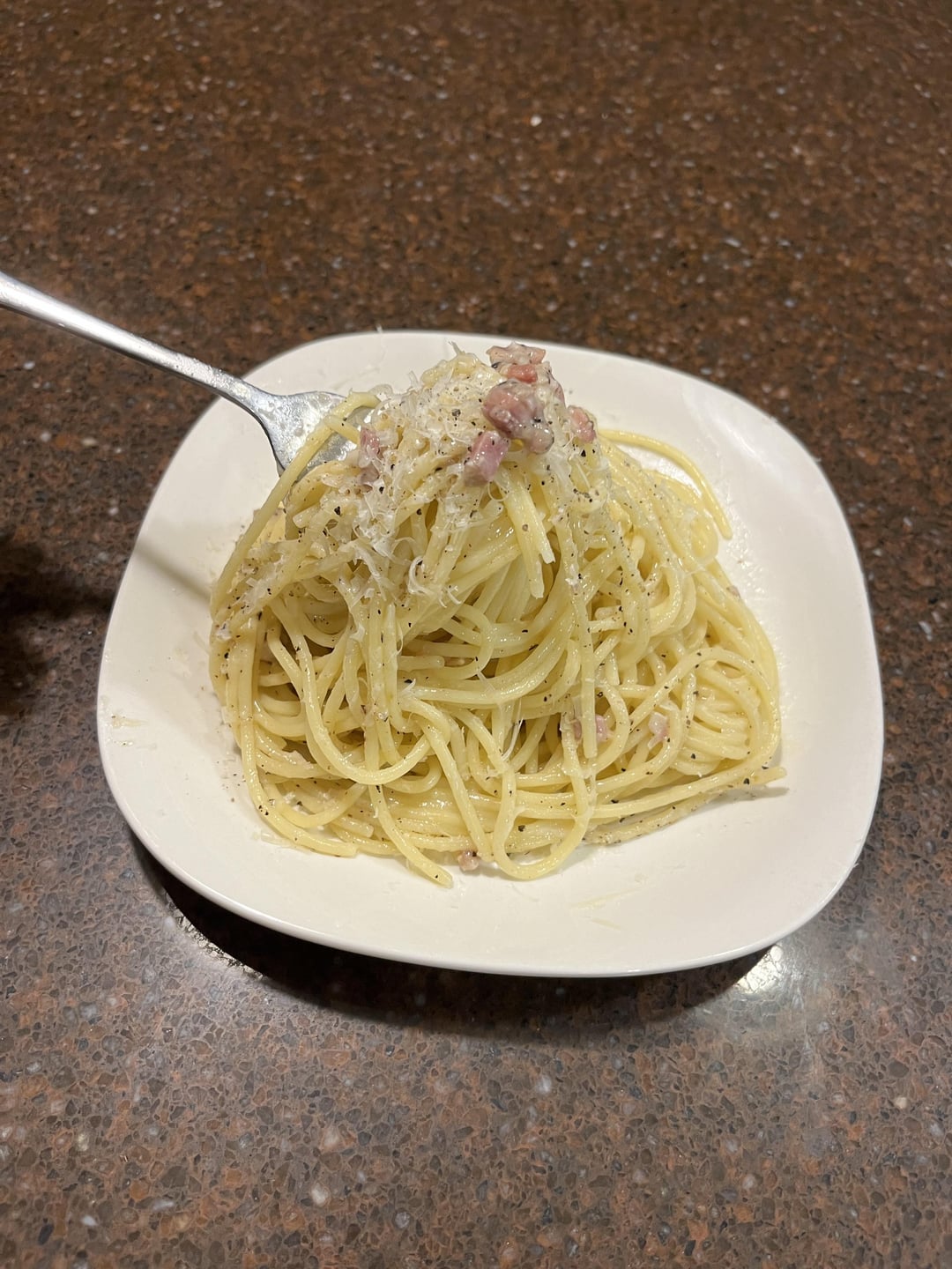This recipe was super simple, I just used store bought pasta and then put some pancetta to cook on low heat (I know that its normally guanciale but I don’t have access to that), and then I added some pepper to the pancetta to toast as well pasta water once all the fat of the pancetta rendered out and was crispy, also shredded like a handful or two of pecorino romano and combined a bit of pasta water with that to form a pasta and then put cooked noodles with the pancetta, quickly incorporated the cheese paste and mixed quick, before adding even more black pepper and cheese to top it off. Salt to taste and enjoy :]