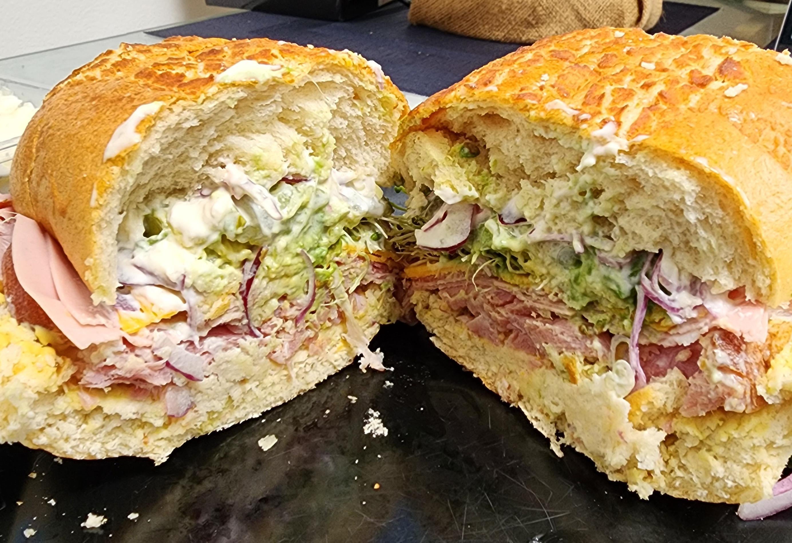 sojojo 10 months ago Cant stop making these.Smoked ham, coppa, mortadella, bacon. Red onion, pickle, clover sprouts, avocado. Med cheddar. Dutch crunch roll, mayo, honey mustard, horse radish.