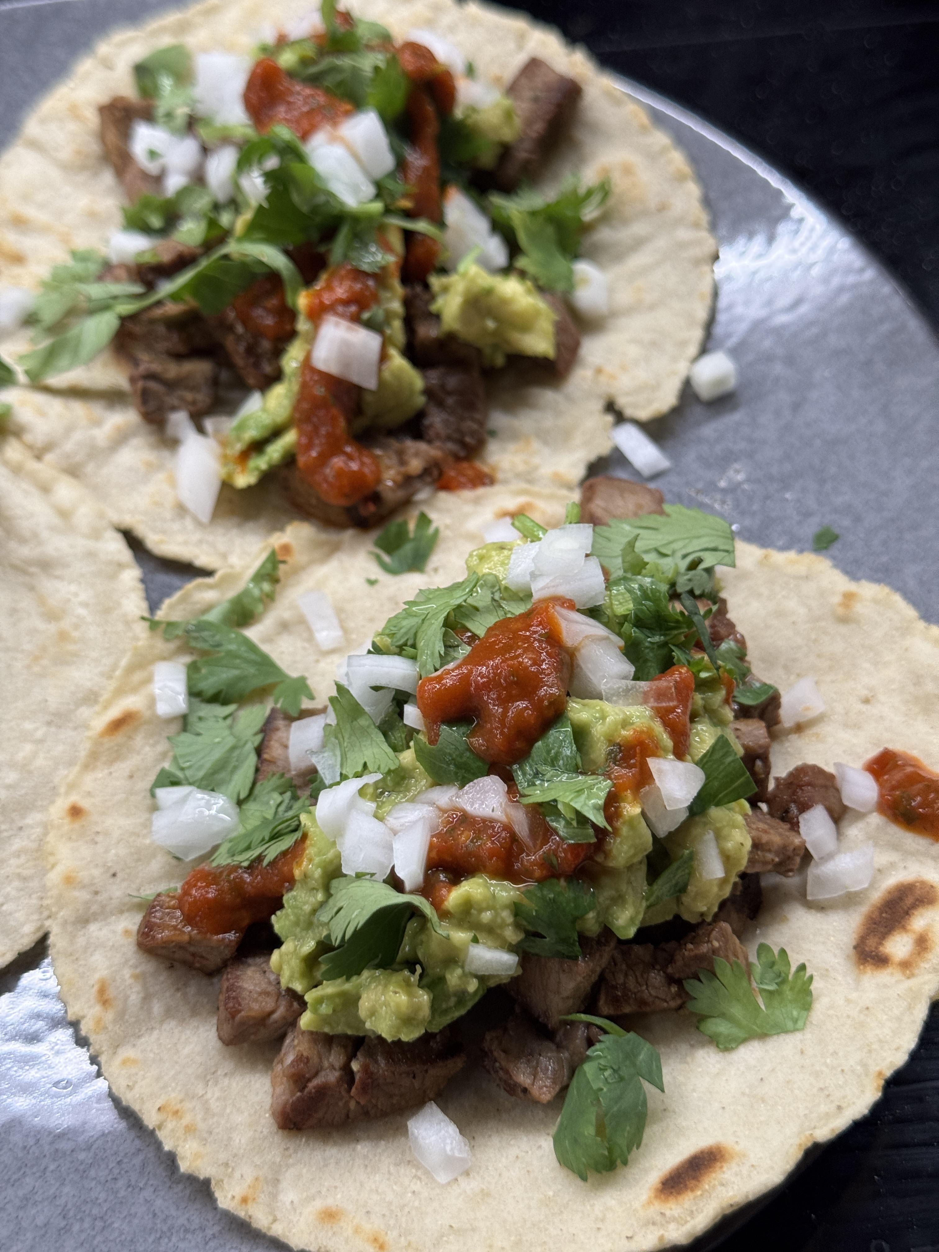 Posted some shrimp Tacos without salsa (avocado and tajin – still stand by it) but many were upset. I give you; tri tip tacos w/ homemade arbol and guajillo salsa.