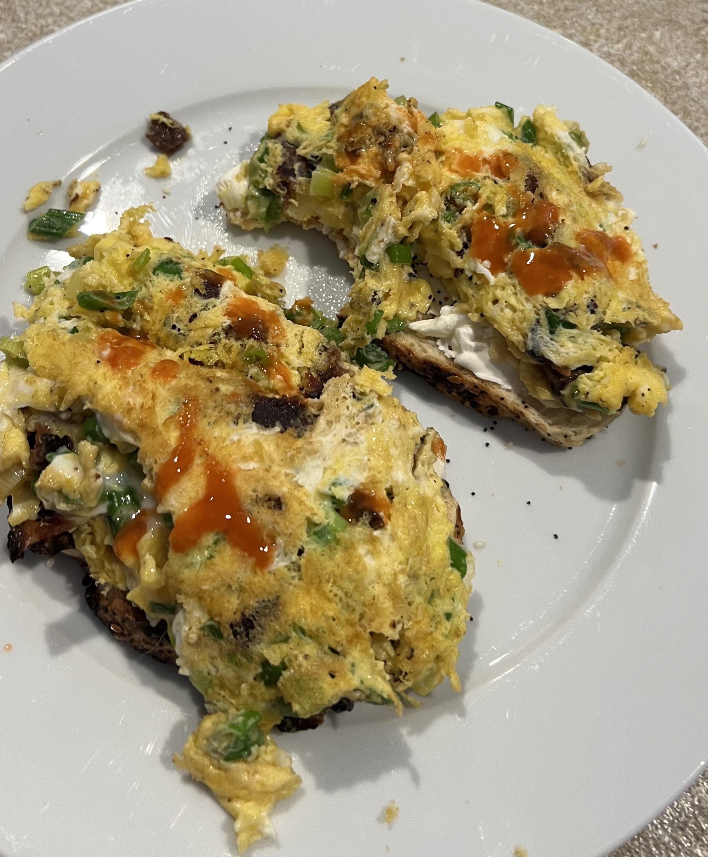 This is 6 green onions and bacon scrambled into eggs and cooked with wagyu tallow. Ate it open faced on some cream cheese sourdough. Divine.