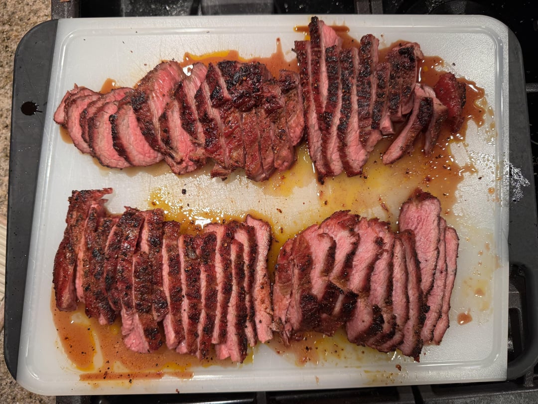 Meat Church Holy Gospel. 225 on the Traeger until 125 internal. Rest. Hard sear on cast iron. Rest. Slice