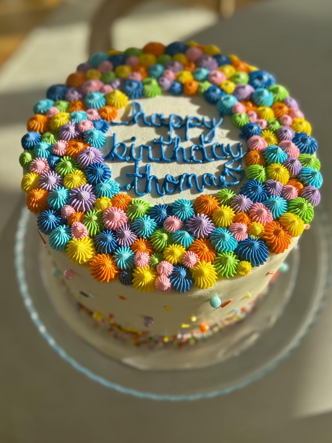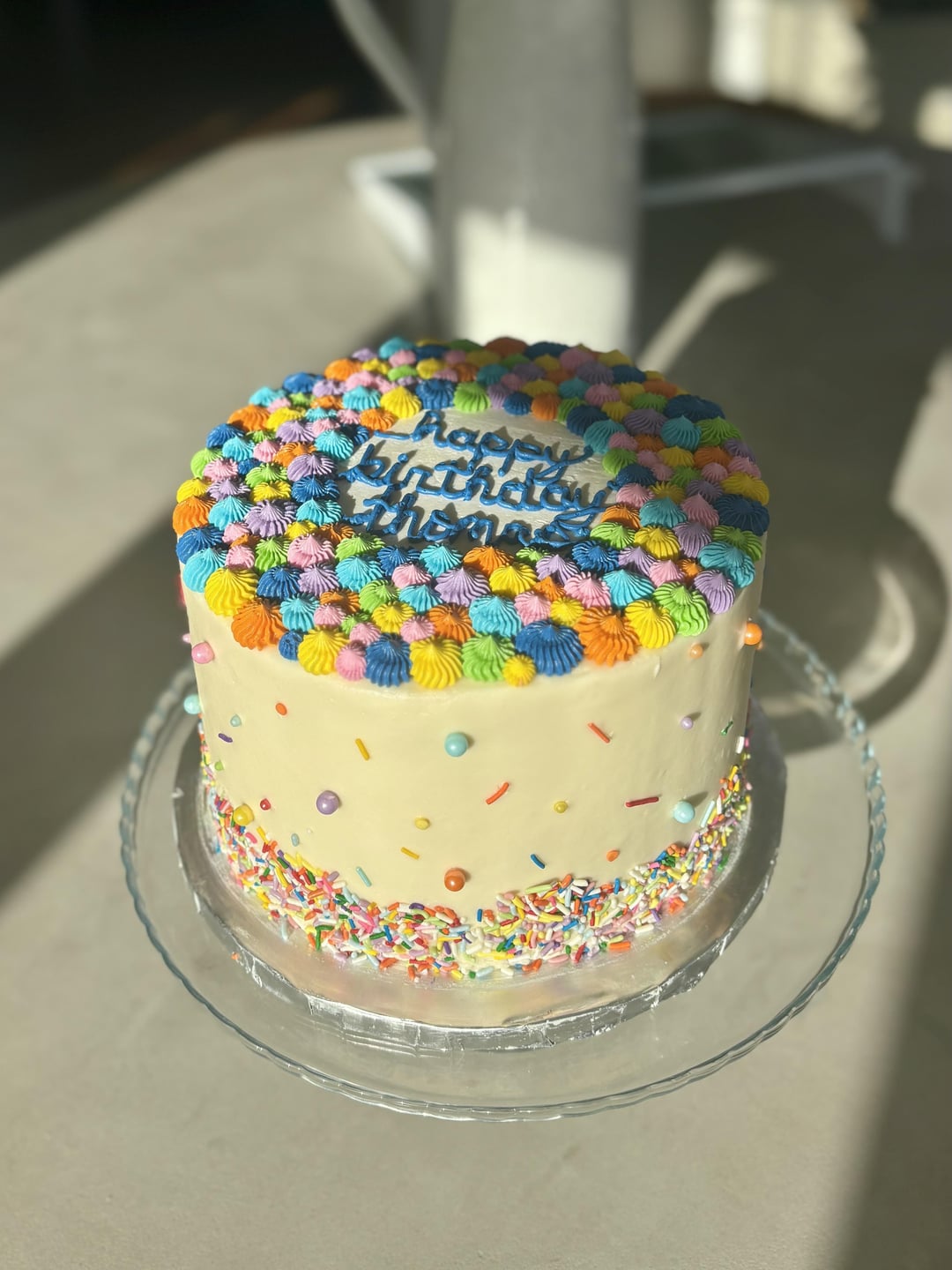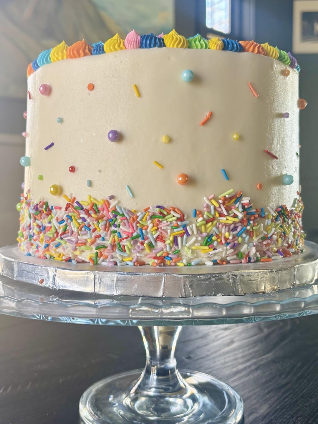 Awesome use of sprinkles! I really like the colors you chose for the top and the design for the whole cake is really cool. I would be very happy to get a slice of this cake