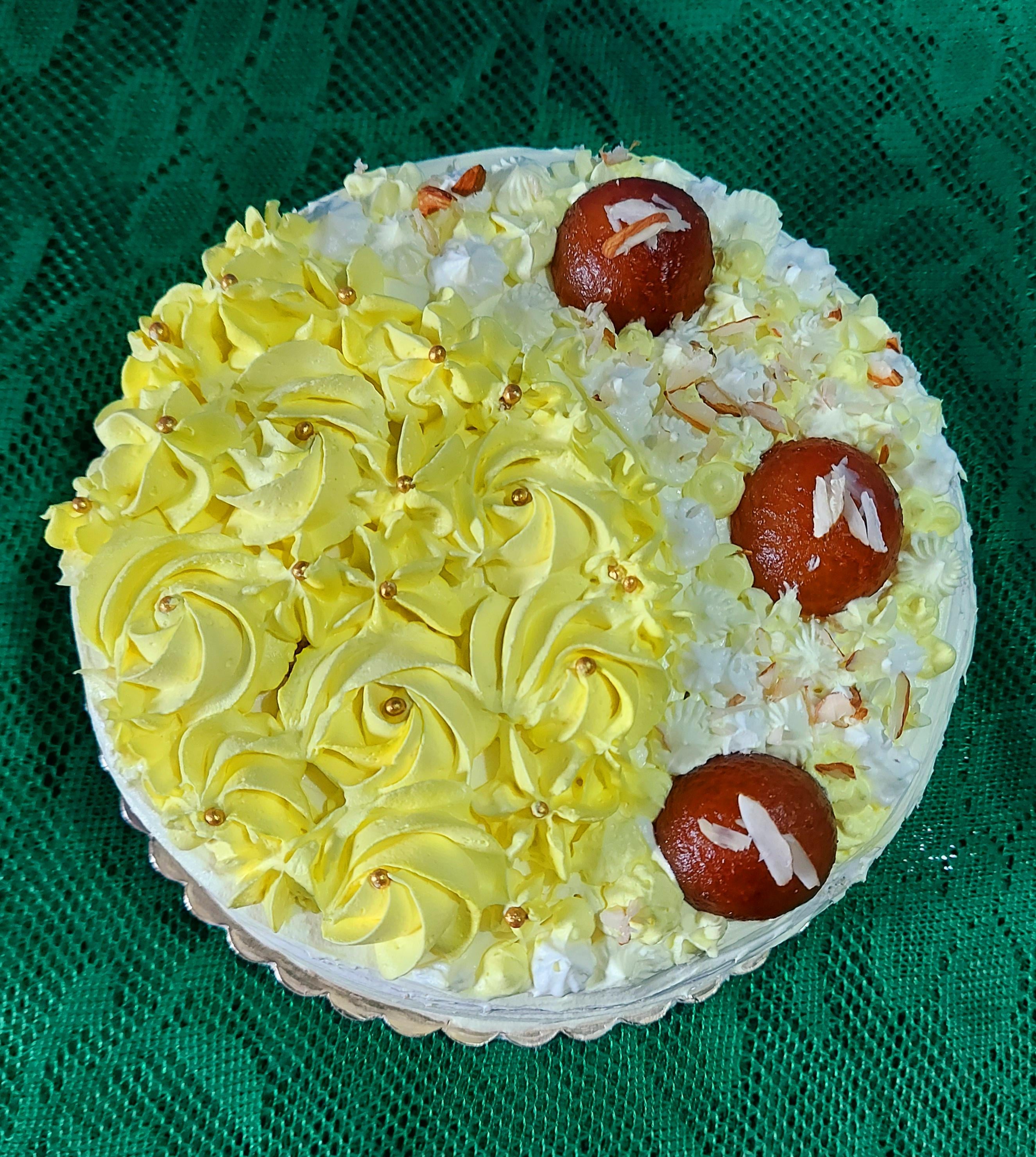 Vanilla sponge cake soaked in gulab jamun syrup. Cut up pieces of gulab jamun and nuts layered between cake layers and vanilla whipped cream.
