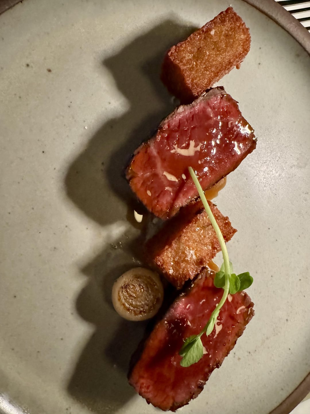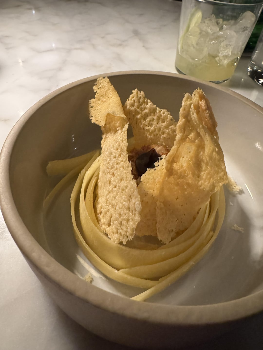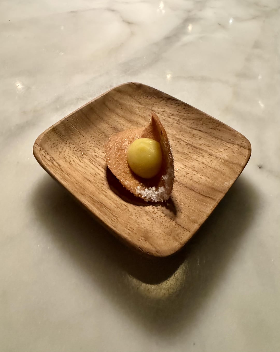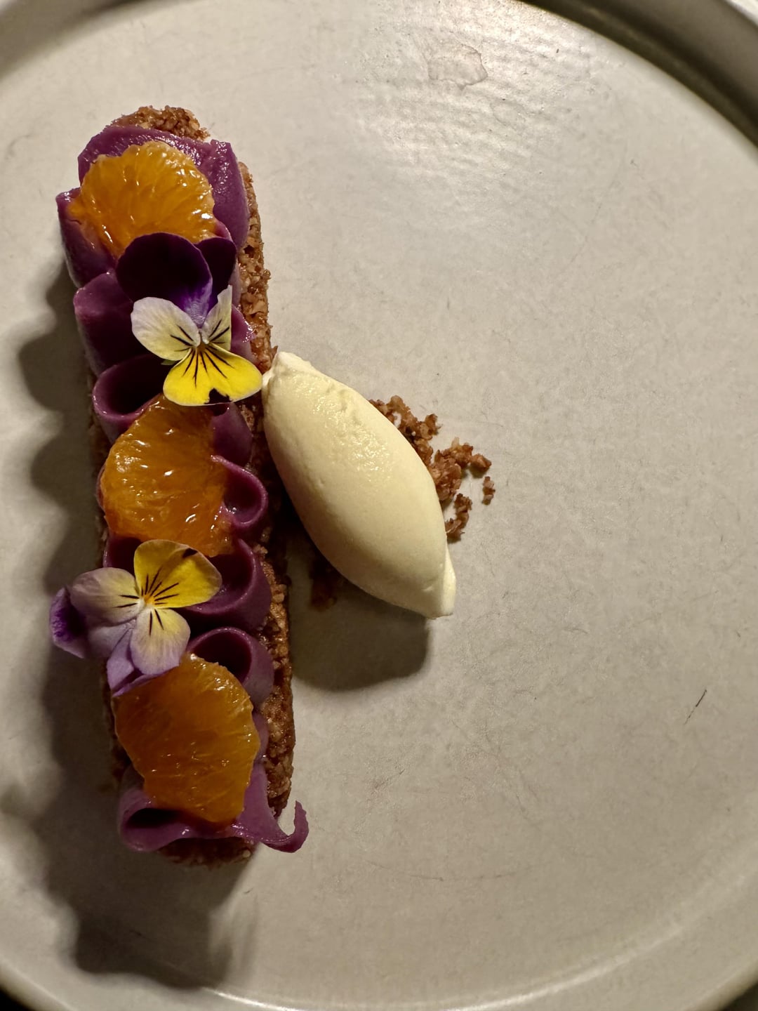 Really liked the experience starting with the space, the industrial chic vibe makes the space perfect, and the service, that was great all along. You have a prix fixe menu with choices from 4 courses and additionally get a few treats like amouse bouche at the start and gourmandises at the end. I started with the foie gras terrine, deliciously paired with a salad. For main (second) had the dry aged NY strip, perfectly cooked, and loved the sides – citrus salad and braised kale with grits. The sourdough bread and local butter that pairs with the bread were also really good. The third course is a cheese course – loved the Valserena parmigiano. For dessert had the Georgia pecan, a creative reinterpretation of the local pecan flavors.