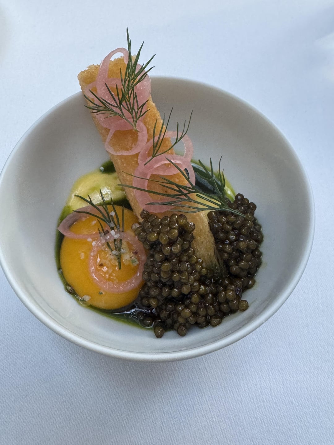 Eggs on eggs on eggs aka caviar, an egg yolk, and some kind of egg cream w/pickled onions, dill, and a sourdough stick