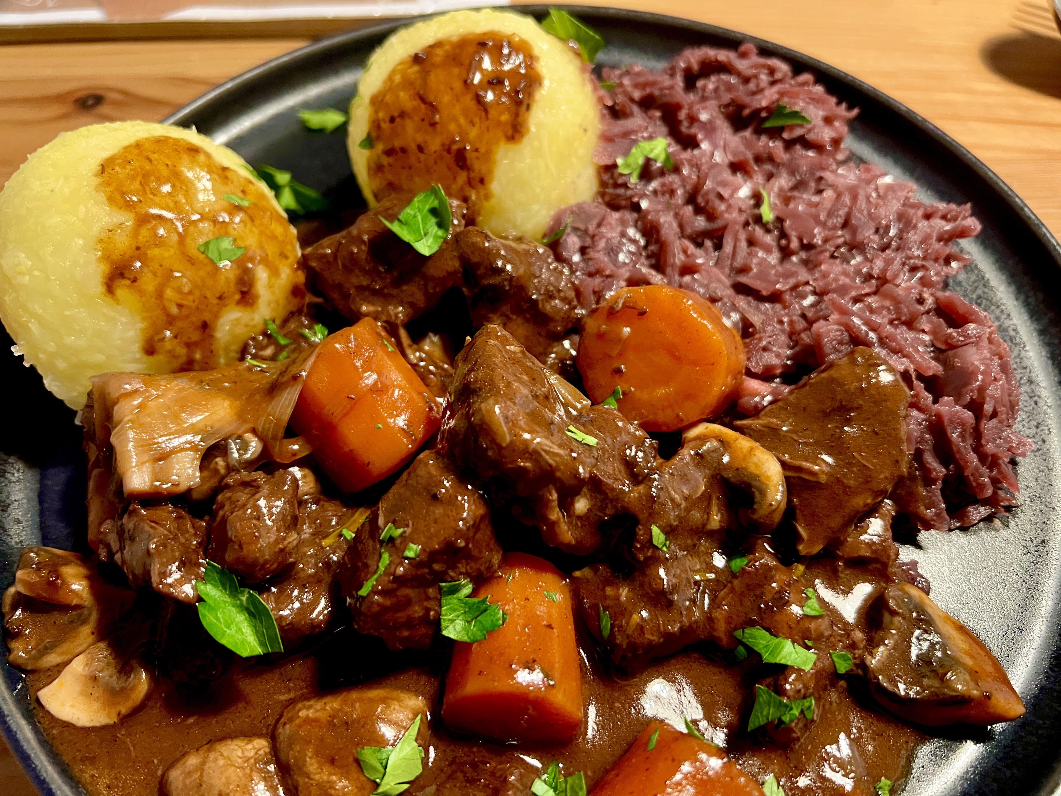 Bœf Bourgignon, red cabbage. potato dumplings