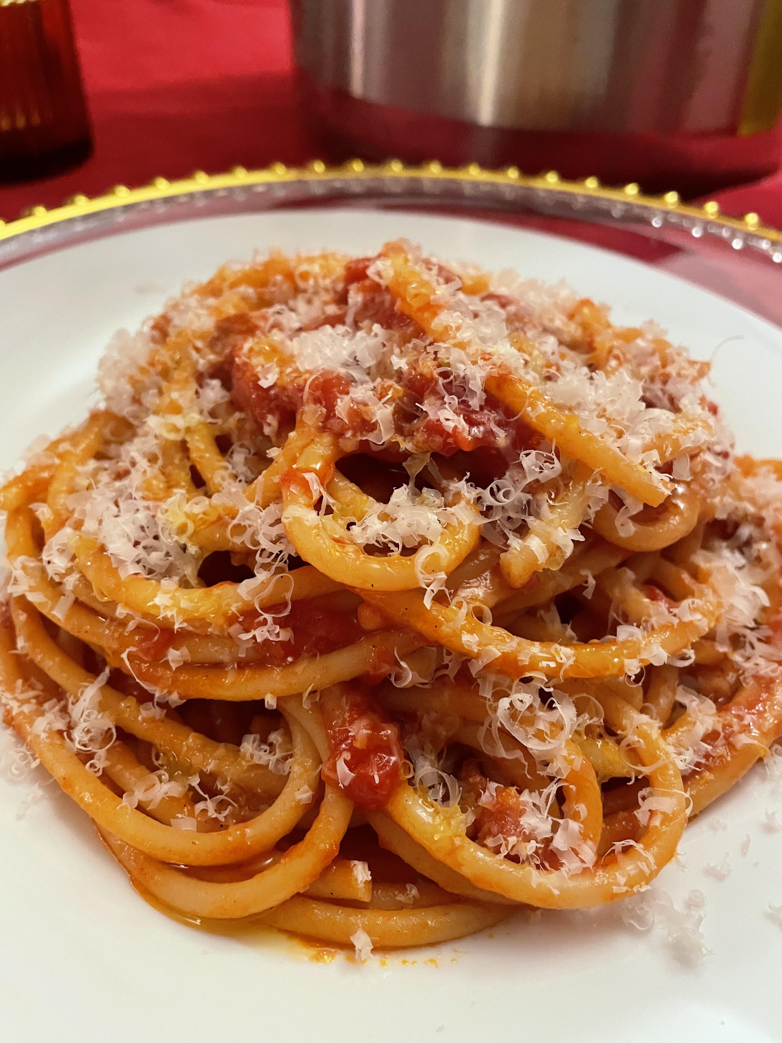 Pancetta White wine Peeled plum tomatoes Salt and Pepper Birds Eye chilli Parmigiano Reggiano Extra virgin olive oil by santin_marcello 4 Comments Jim_Clark969 9 months ago Looks simple and lovely executed. Molto buono wrathbringer1984 9 months ago Looks good! False-Ad-8561 9 months ago Could you share the recipe? ☺️🙏🏻 AwkwardInmate 9 months ago Buoni, anche senza la pancetta.Write A CommentYou must be logged in to post a comment.