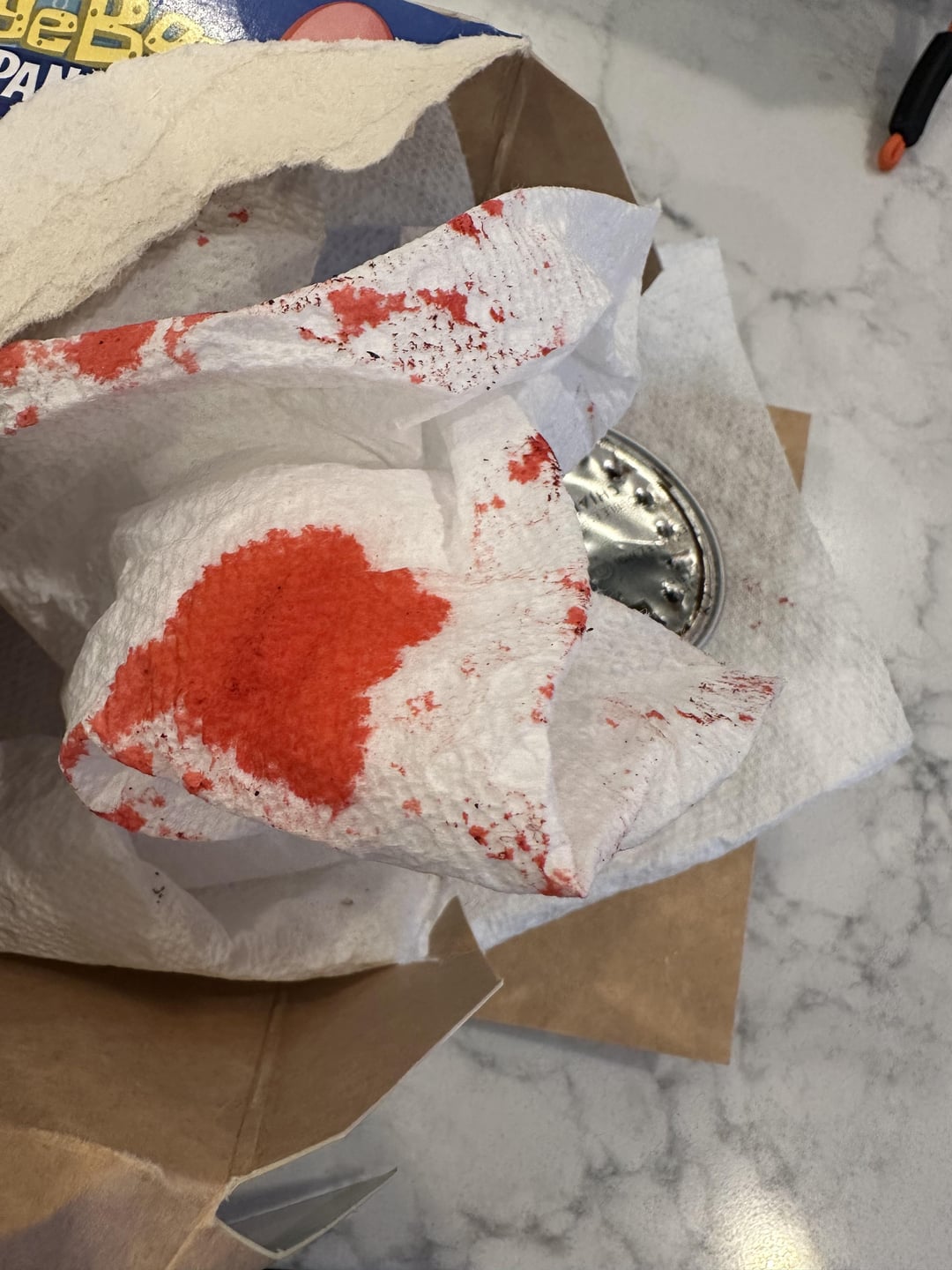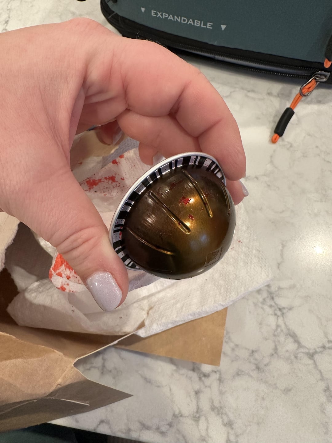 Has this happened to anyone before? We put a pod in, one that I use daily and noticed when we lifted the top that there was bright red liquid all over the pod and inside the machine. The coffee looked quite normal. Any ideas what this could be?