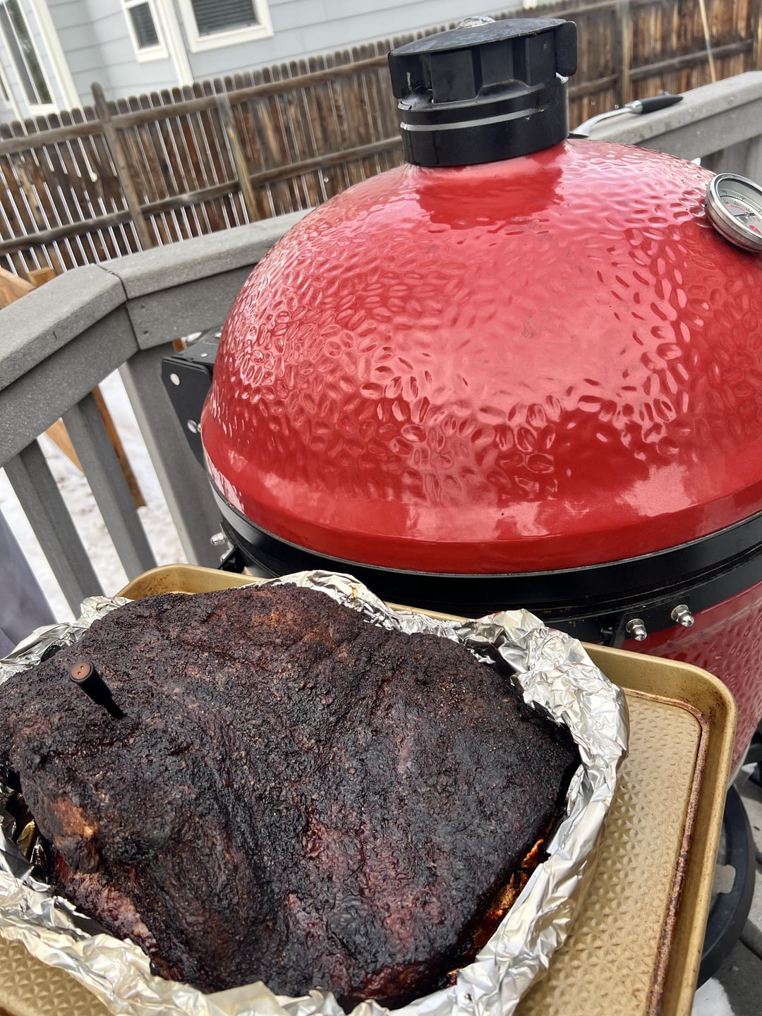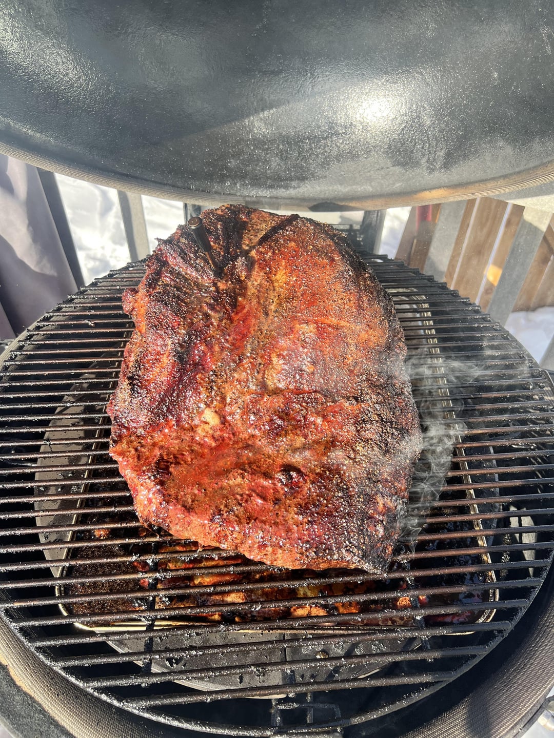 1:00 – checked the basket and my fuel was almost all gone. Using Jealous Devil, not sure if it’s the charcoal, but that burned a lot fast then I thought. Refilled and restarted the basket, reassembled the double indirect and brisket is back on. Looking good, with good bark, but not as tender as I need/want it.