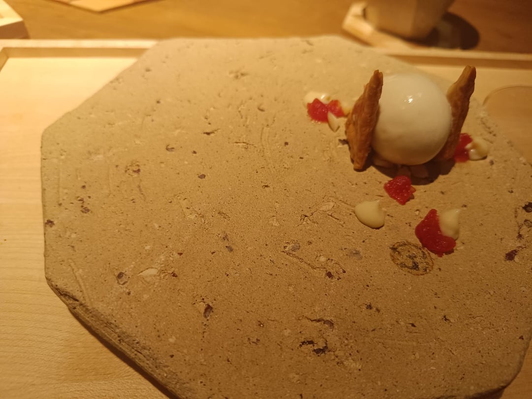 12. Almond crumble with icecream, tomato and some spicy stuff.