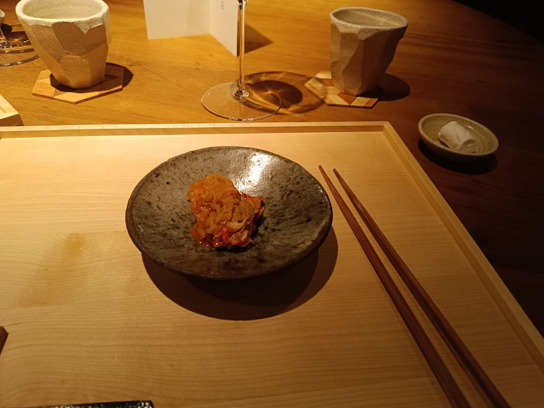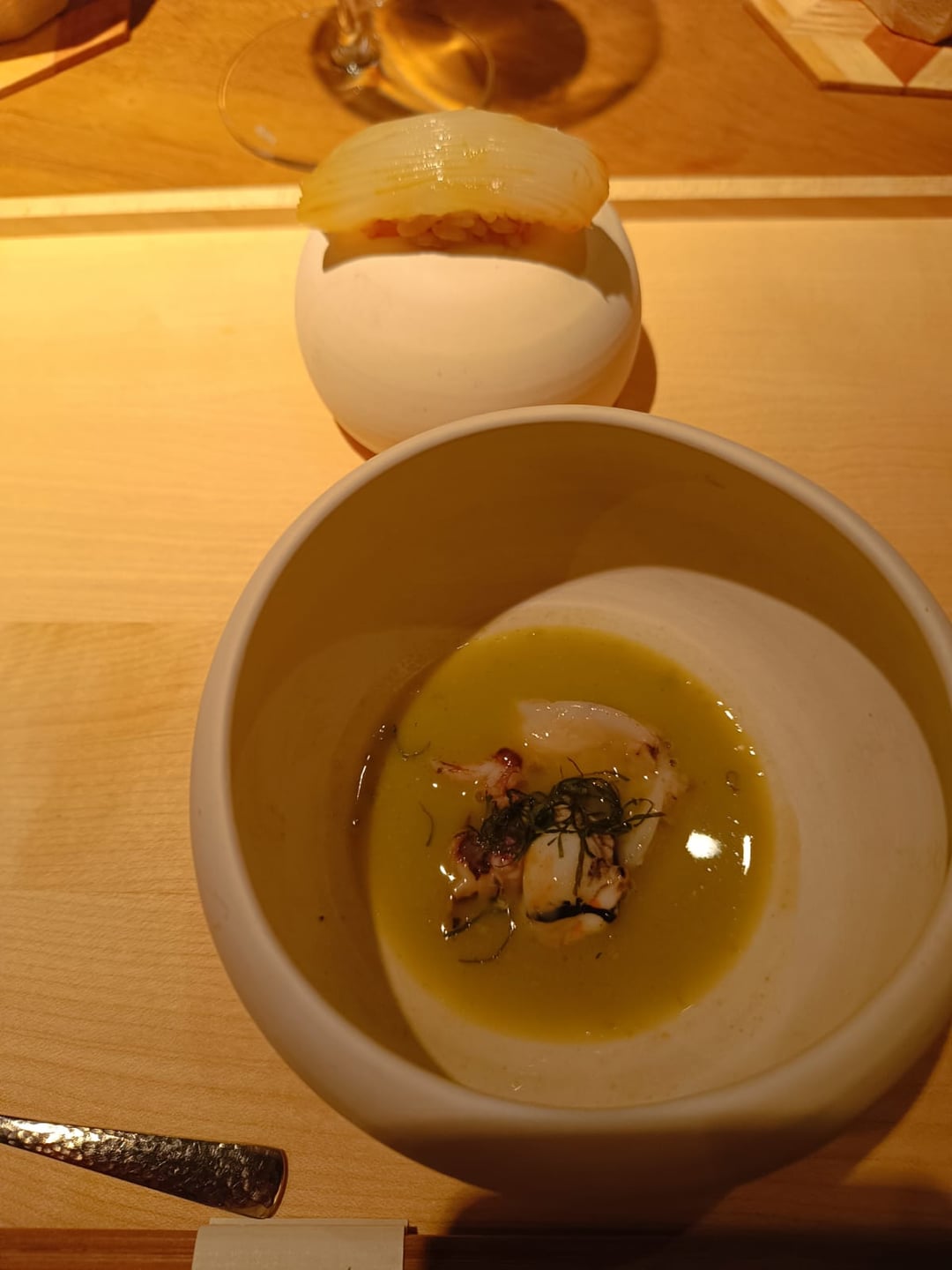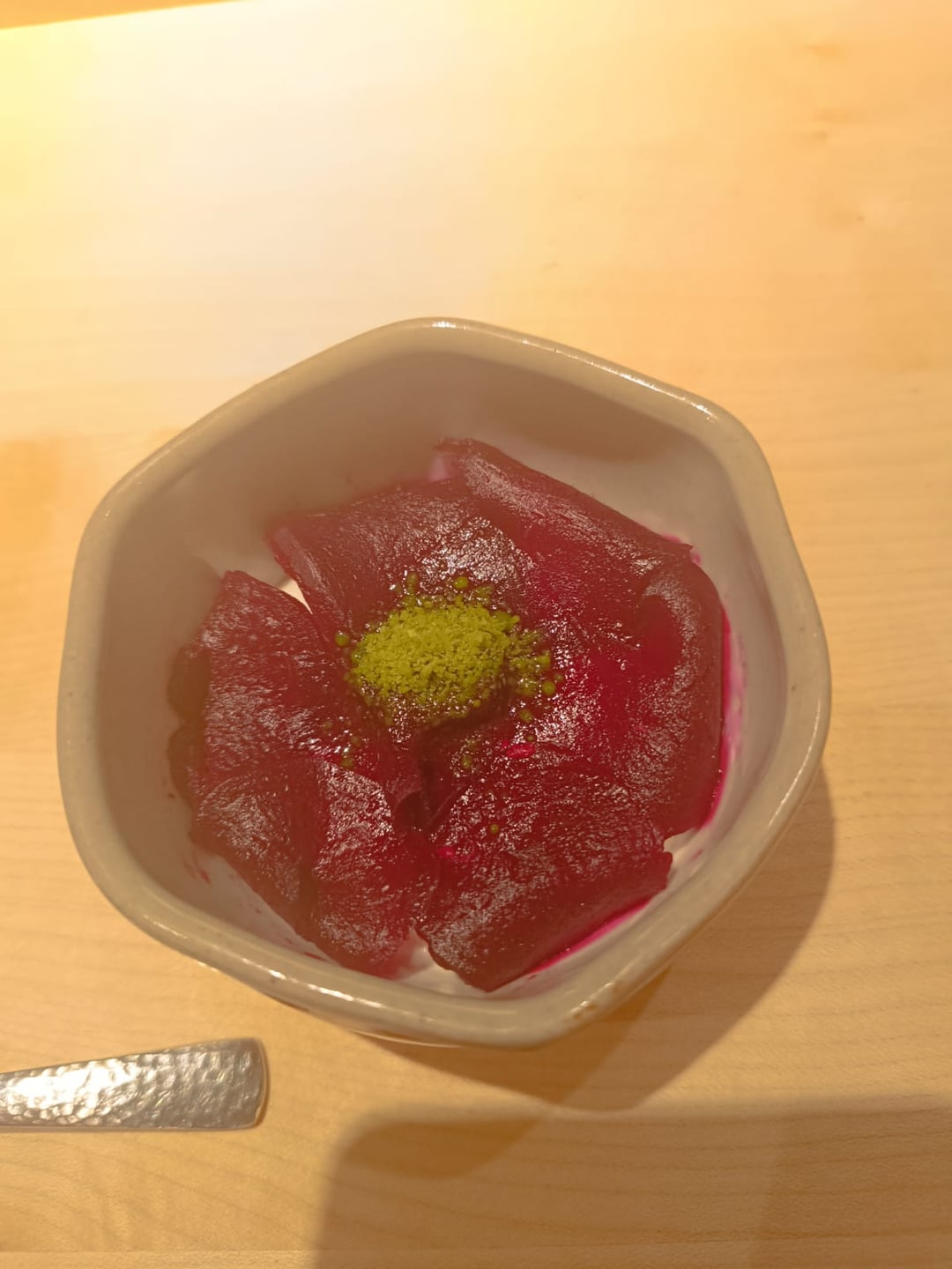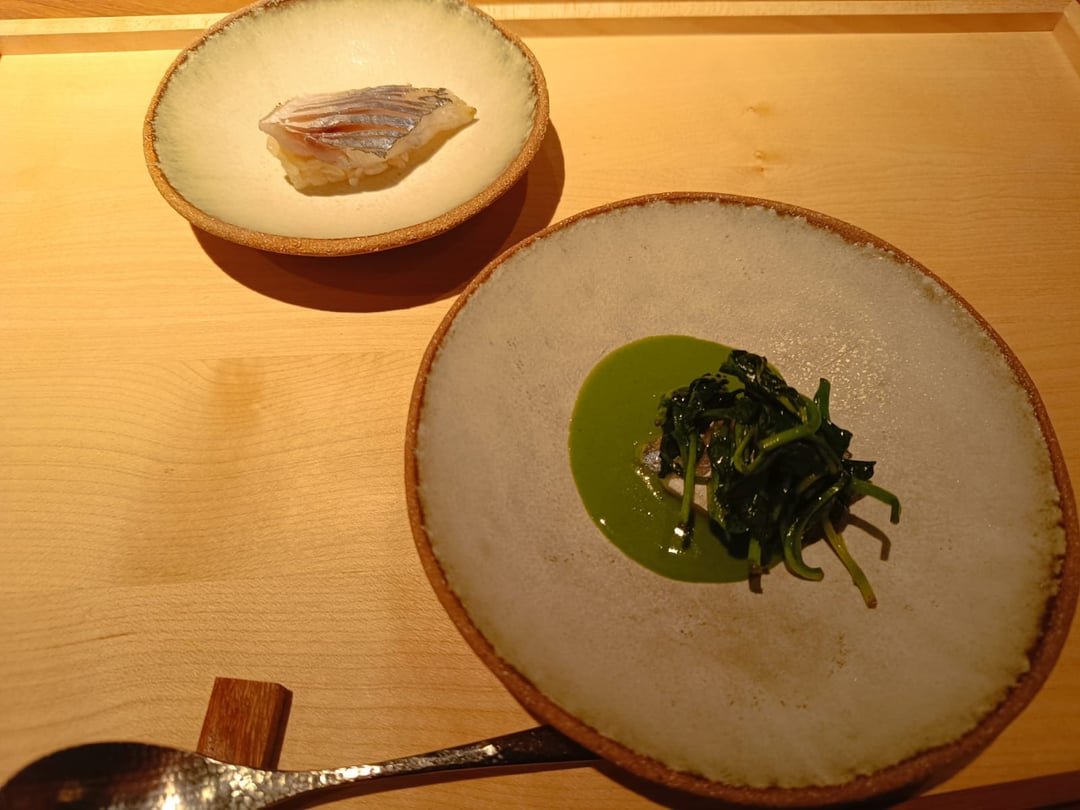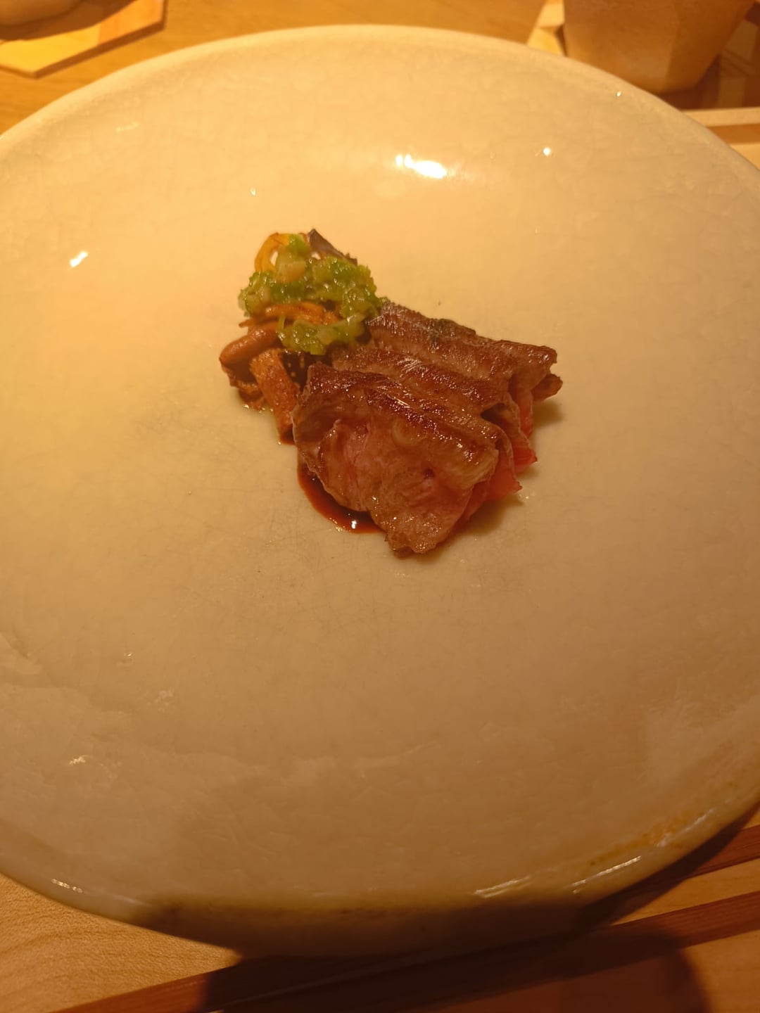 1. Salmon Nigiri with esturion caviar and a souce I don’t remember. 2. Scallop crunchy with fish broth. 3. Mini calamari with calamari nigiri 4. Halibut cheeks with pilpil souce ans crunchy wakame. 5. Some fish I don’t remember with weeds from japan, really nice. And the nigiri flamed version. 6. Rice with lobster. 7. Lobster nigiri. 8. 3 types of tuna nigiri (toro, maguro and another I don’t recall). 9. Wagyuo with mushrooms. Omw… 10. Eel sushi from delta del Ebro with yakisoba souce buff. 11. Beetroot with panacota and matcha tea. 12. Almond crumble with icecream, tomato and some spicy stuff.