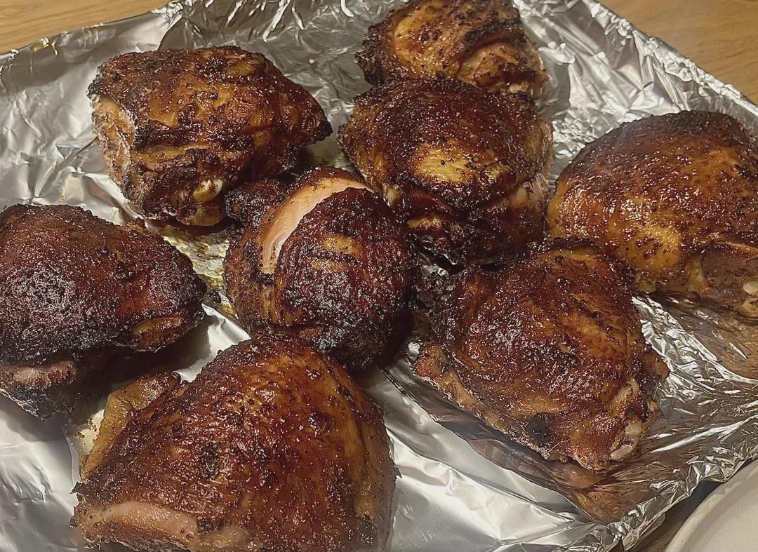 Set up 2-zone cooking (I use a Smoke&Sizzle and love it!). Get the temperatures up to 300° before throwing in a large wood chunk directly on the coals, loading up the thighs, and rocking the cook at around 350-400° for about 30 minutes before checking for color and internal temp.