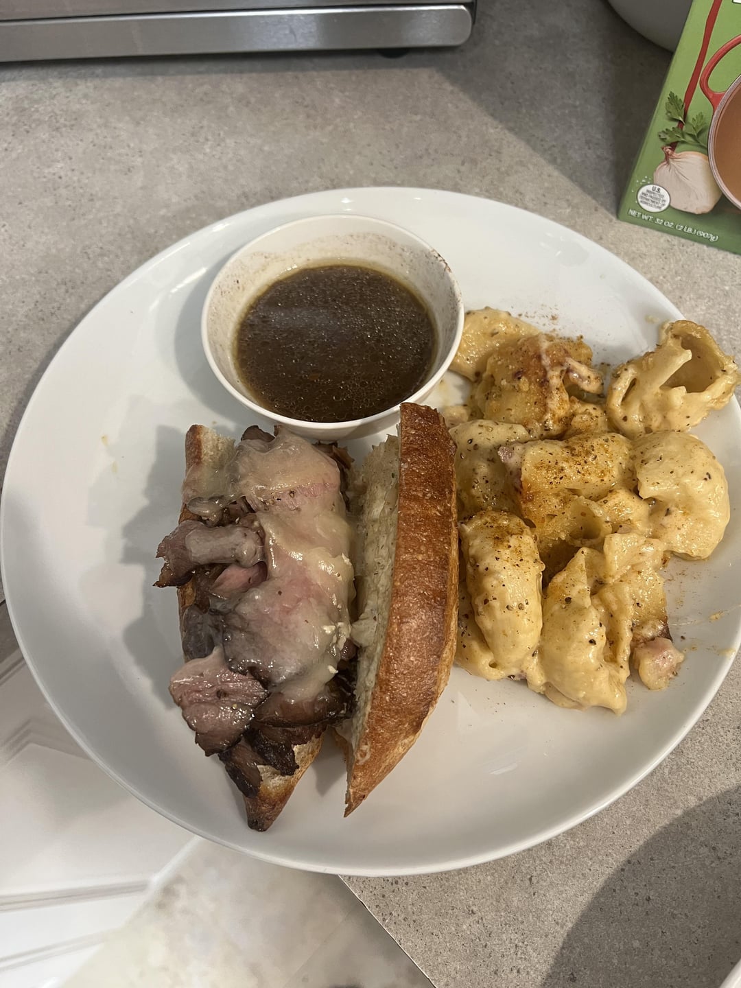 133 for 26 hours, pulled a bit earlier than usual to get to a football party on time (Go Ravens!). Strained the bag juices and simmered with beef broth, shiitake stock, Worcestershire and some seasoning, then the drippings after searing in the air fryer.