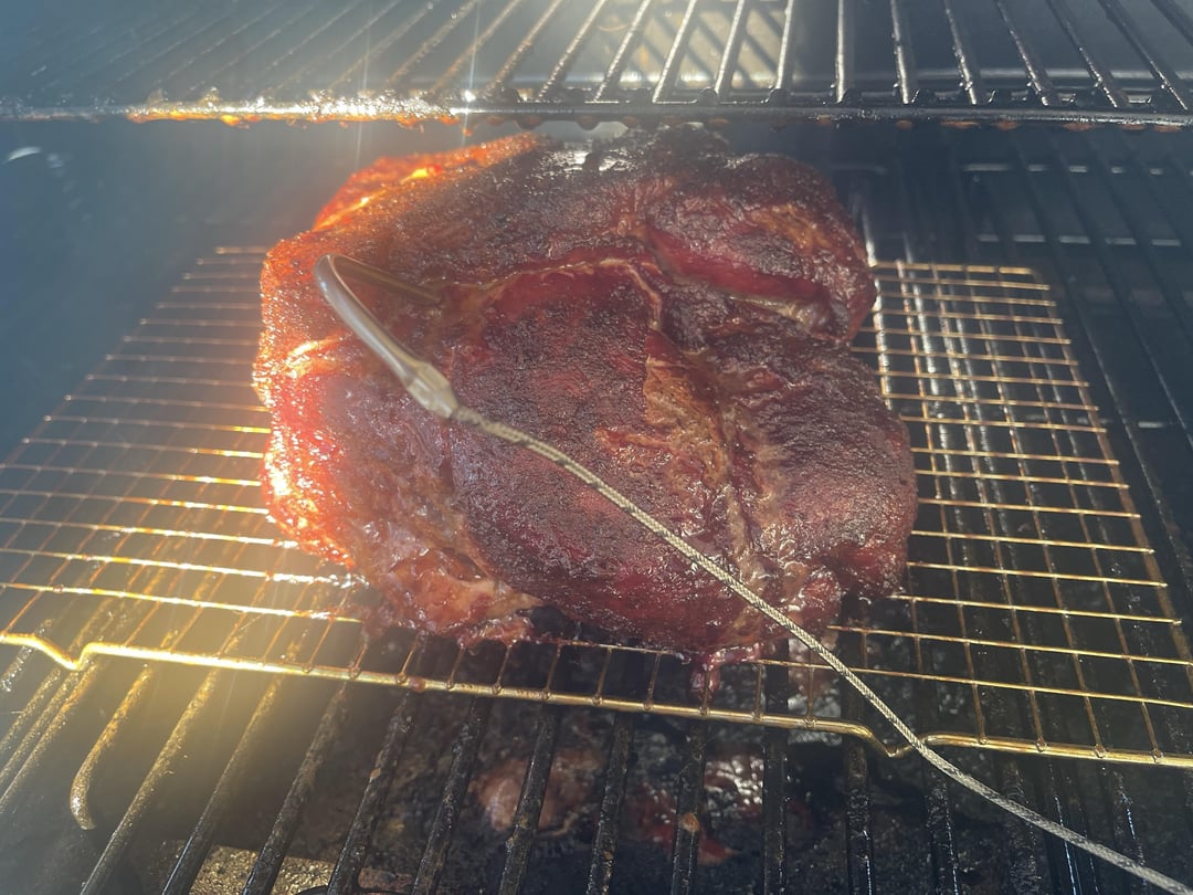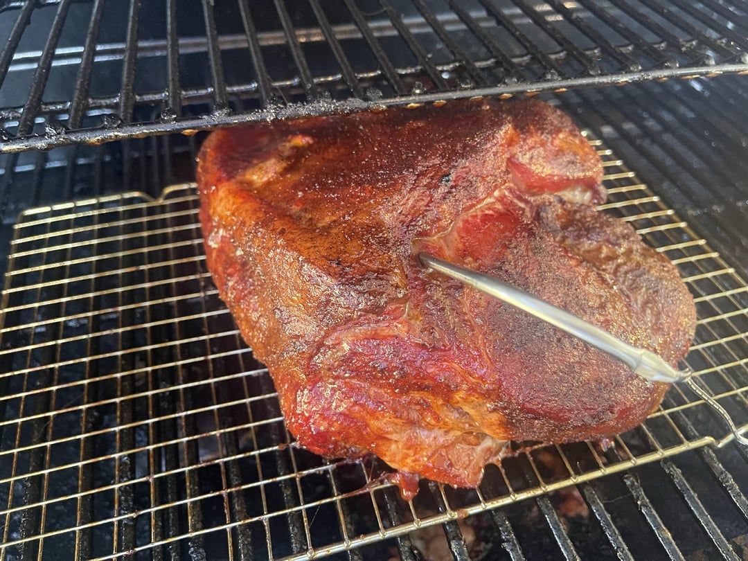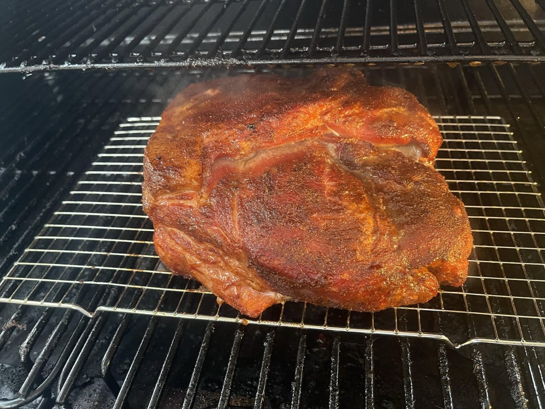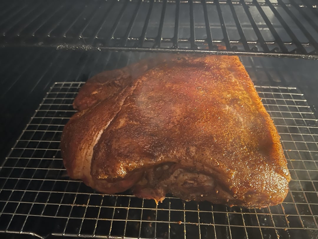 Smoked a 17-pound boneless pork shoulder to make pulled pork for dinner. It's been injected with a mixture of apple juice, apple cider vinegar, Worcestershire sauce, maple syrup, melted butter, and spices, and marinated in the fridge overnight.