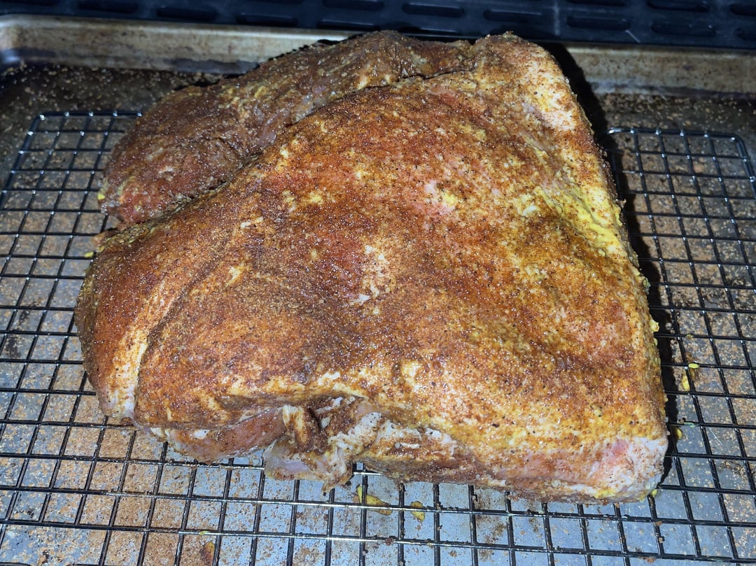 Yellow mustard as a binder and sprinkled with my own homemade pork rub.