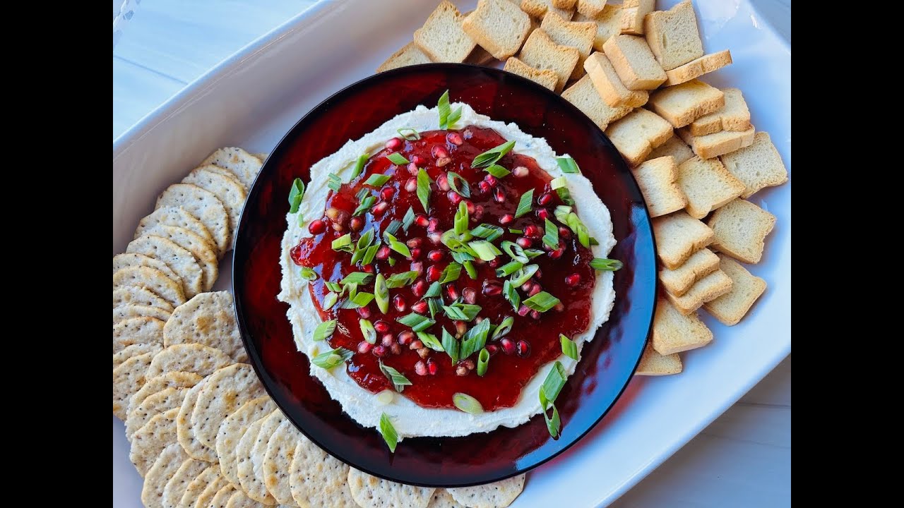 Sprinkle chopped chives and pomegranate seeds over the top for a festive touch of color, crunch, and flavor. Serve with crackers or melba toasts.