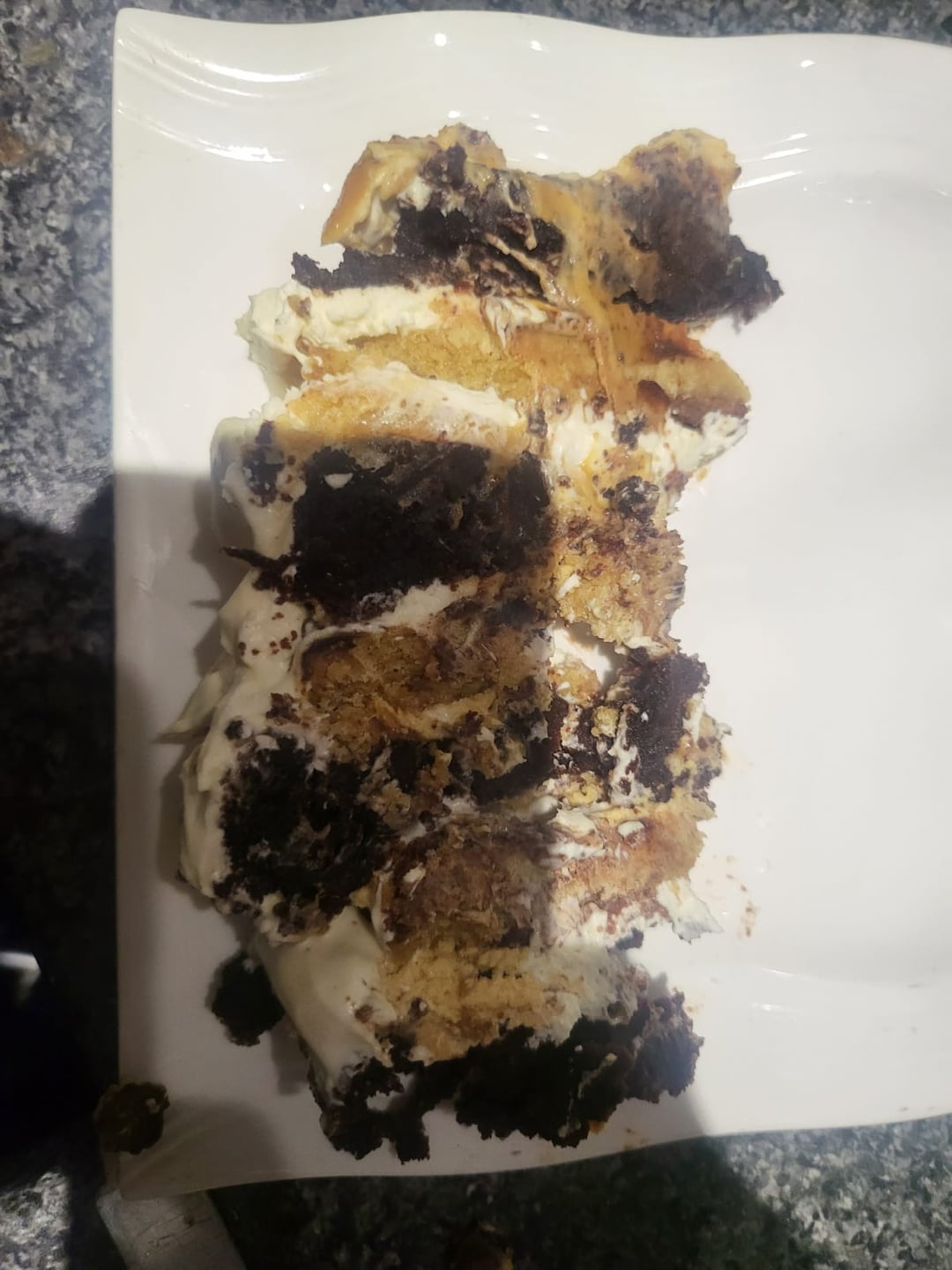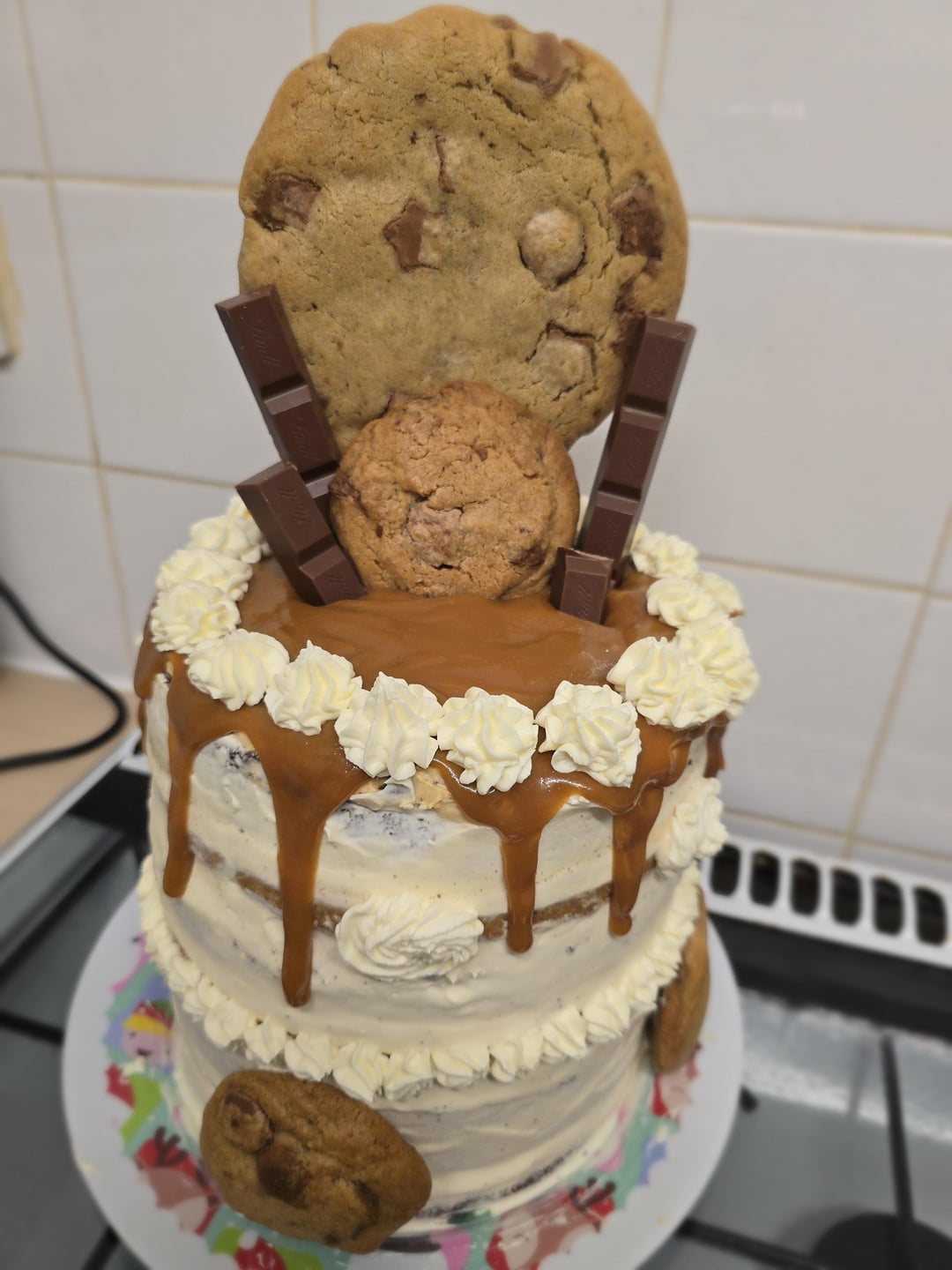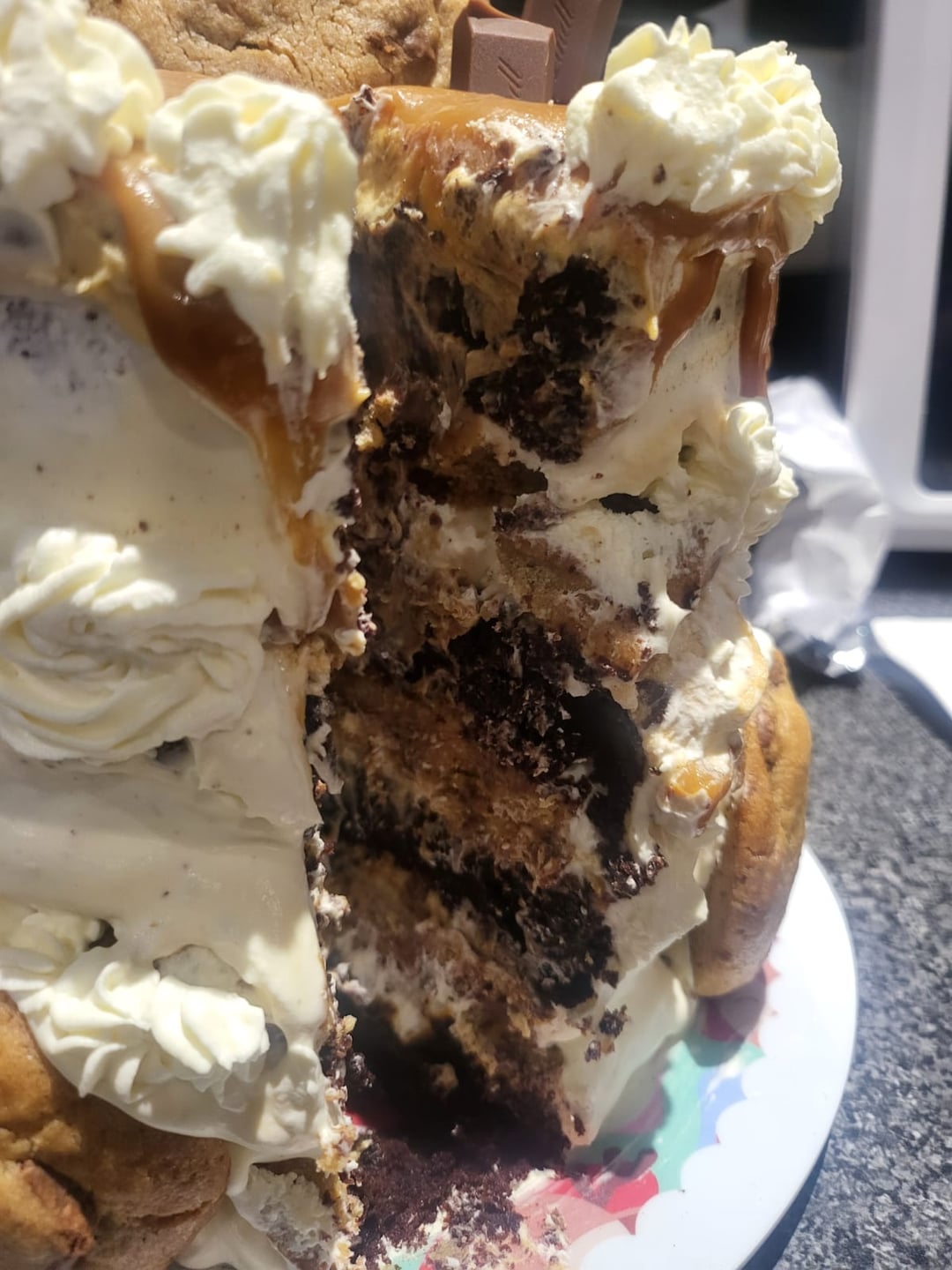 Chocolate cake layered with cookies, whipped cream frosting, salted caramel out of a tesco jar, salted caramel buttercream mixed with chocolate chips