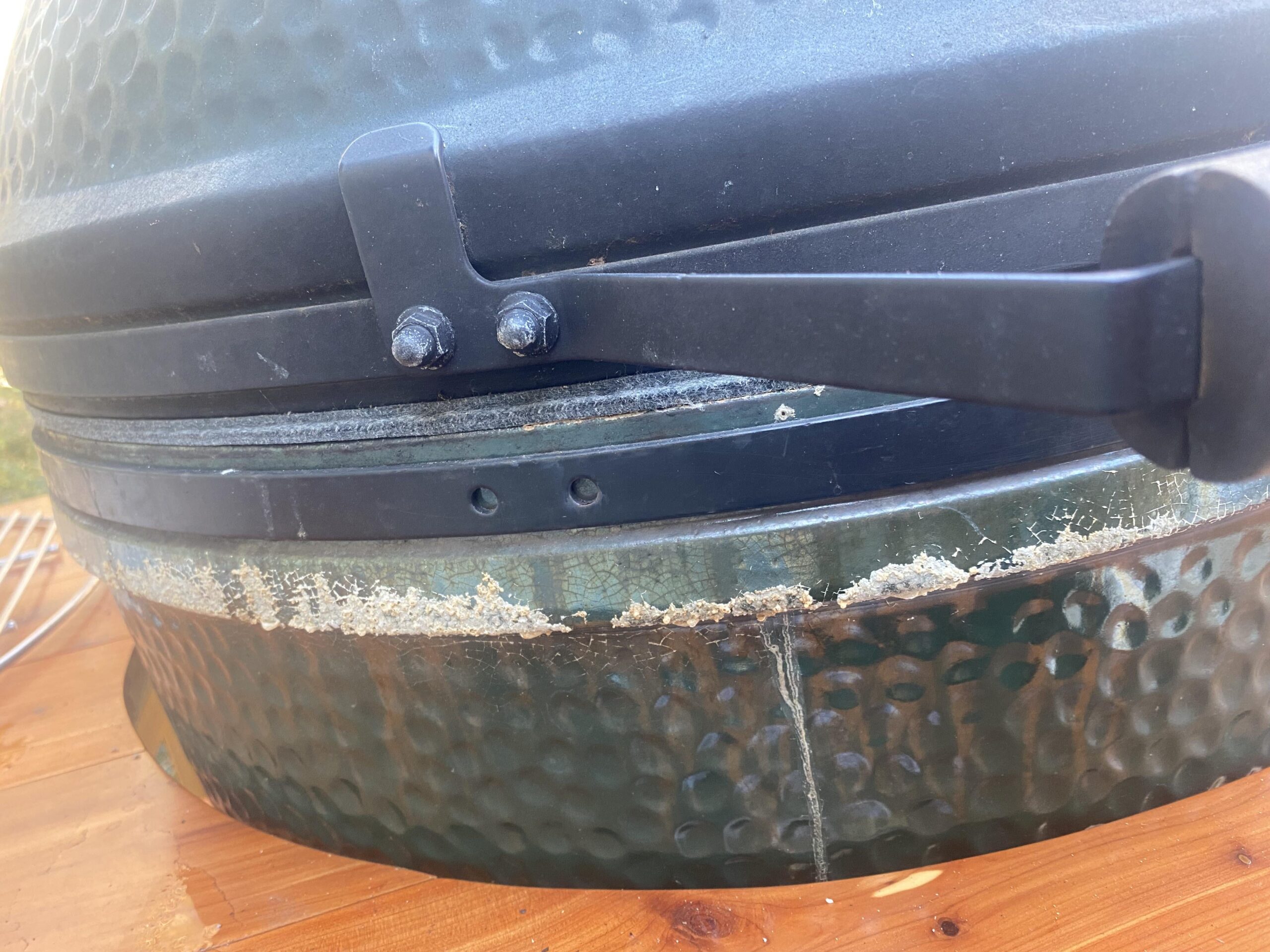 Fired up this 3 year old used egg to do pizza and this stuff appeared. The previous owner cleaned it ONCE like 2 years ago, took ages to do myself. Anybody know if it’s just grease coming out from the high temp (500) or something else I should be concerned about? To be clear, that white stuff was not there when I started things up this morning.